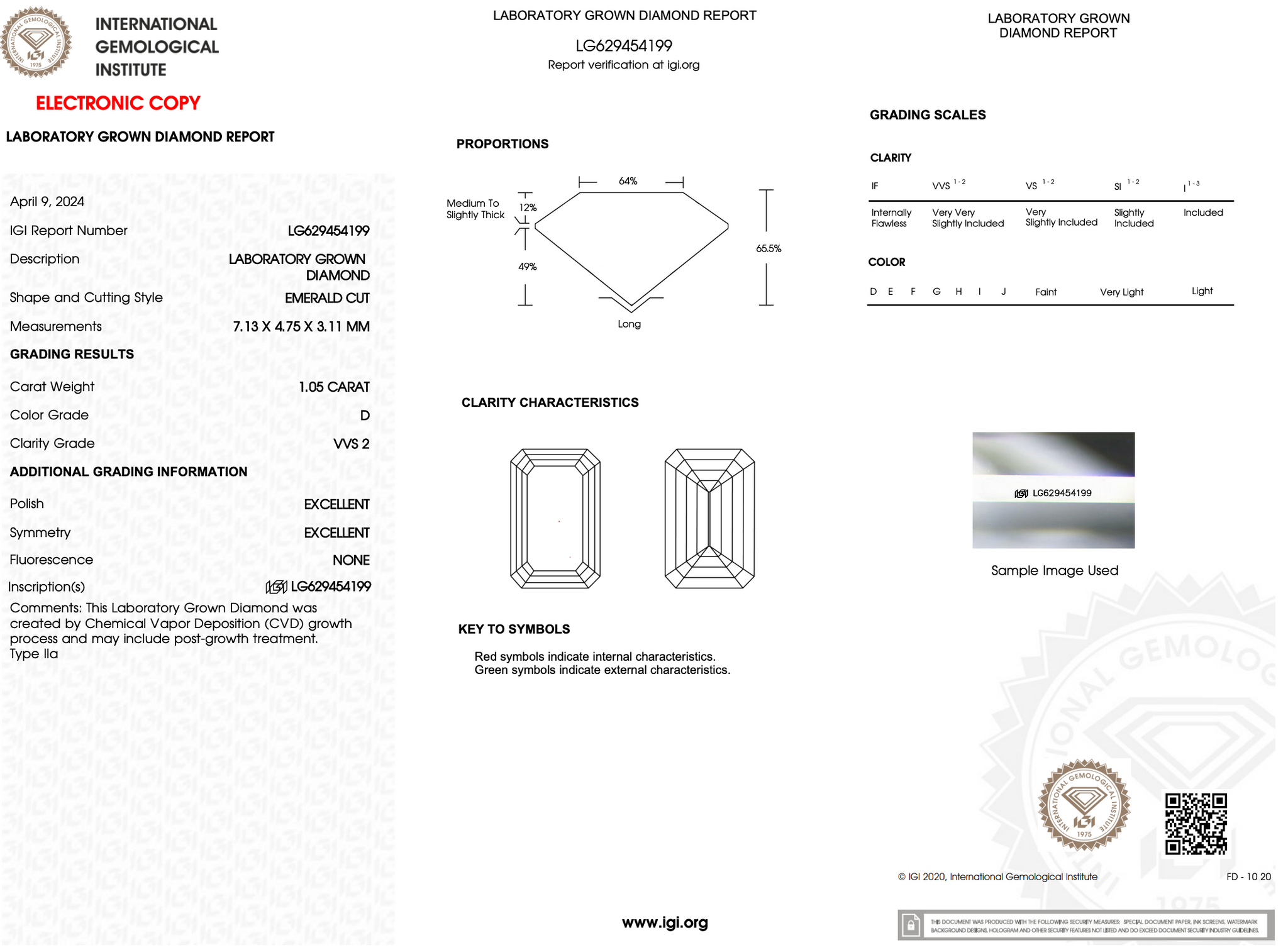 1.05 Carat D-VVS2 Emerald Lab Grown Diamond - IGI (#122007)