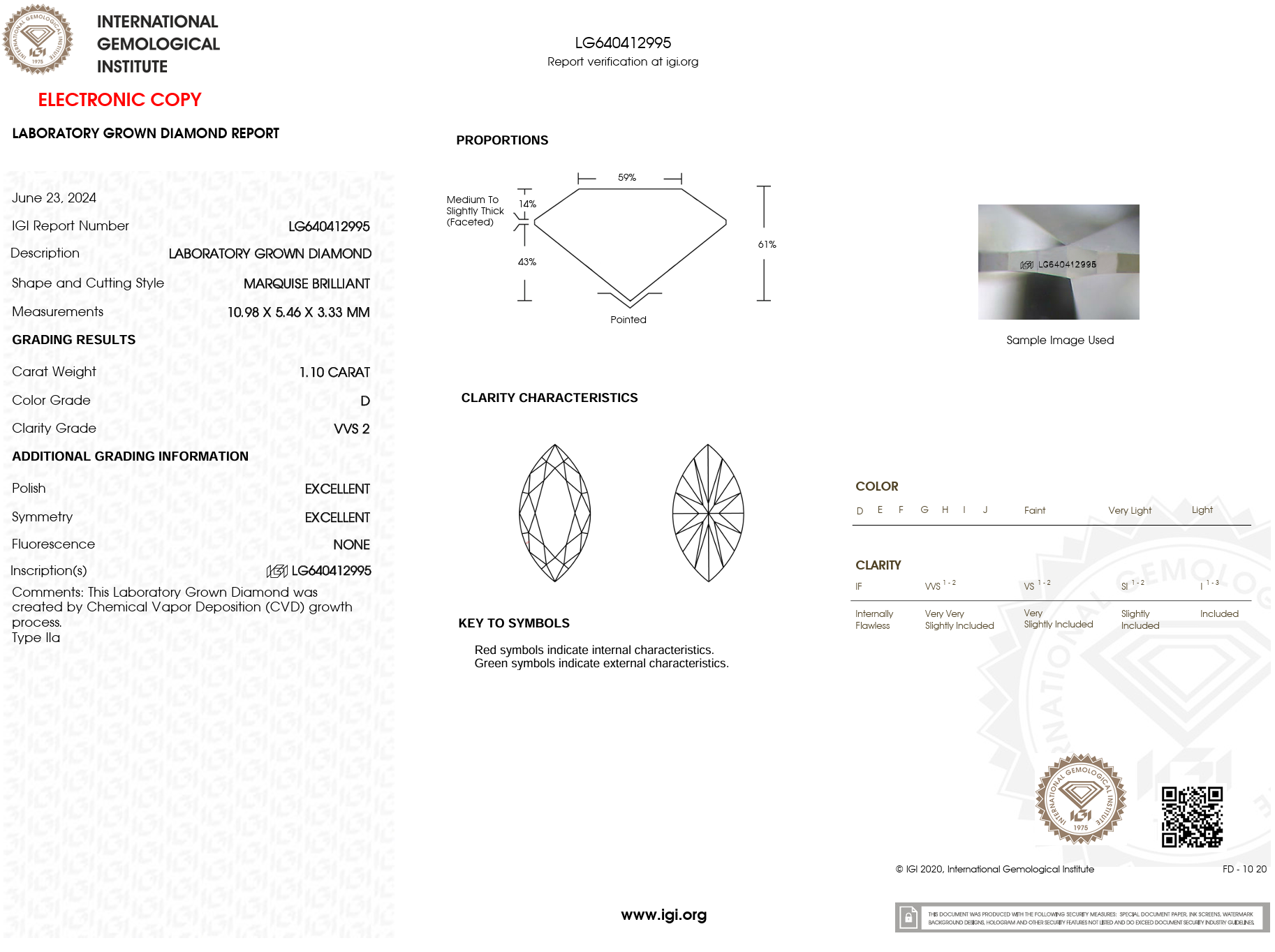1.10 Carat D-VVS2 Marquise Lab Grown Diamond - IGI (#121839)