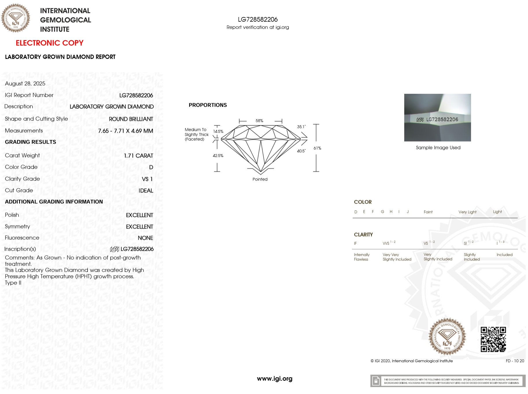 1.71 Carat D-VS1 Round Lab Grown Diamond - IGI (#121780)