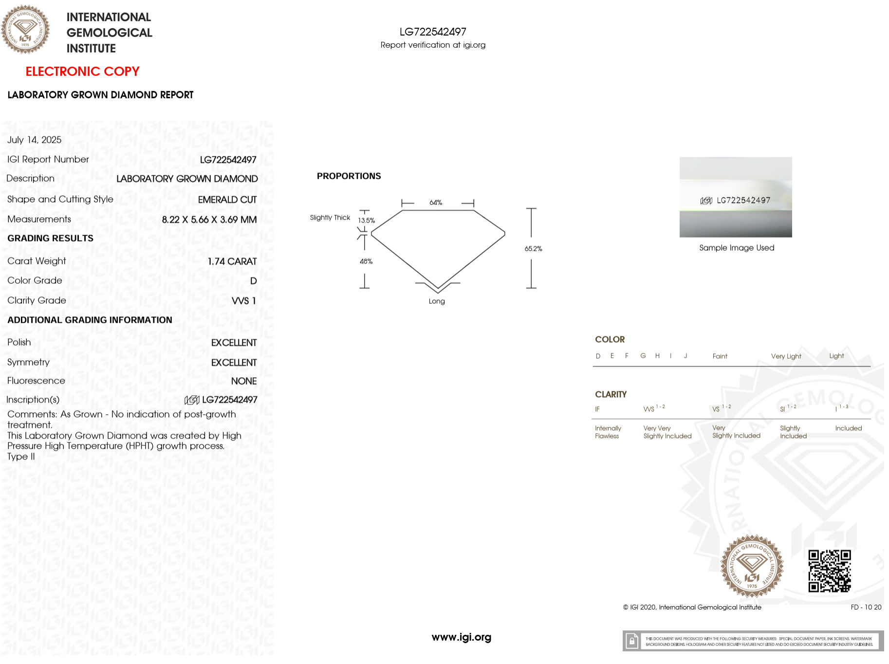 1.74 Carat D-VVS1 Emerald Lab Grown Diamond - IGI (#121797)