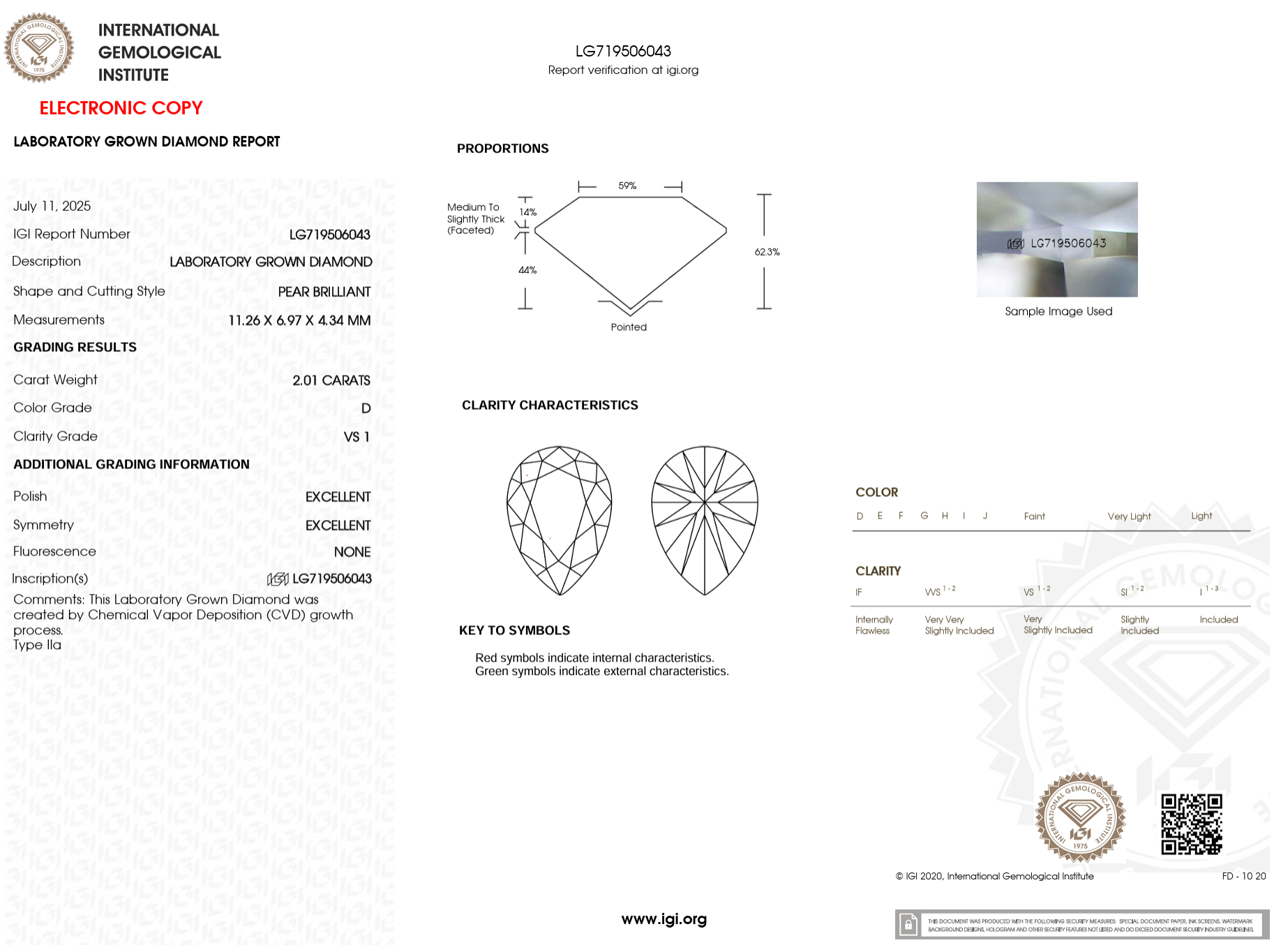 2.01 Carat D-VS1 Pear Lab Grown Diamond - IGI (#121796)
