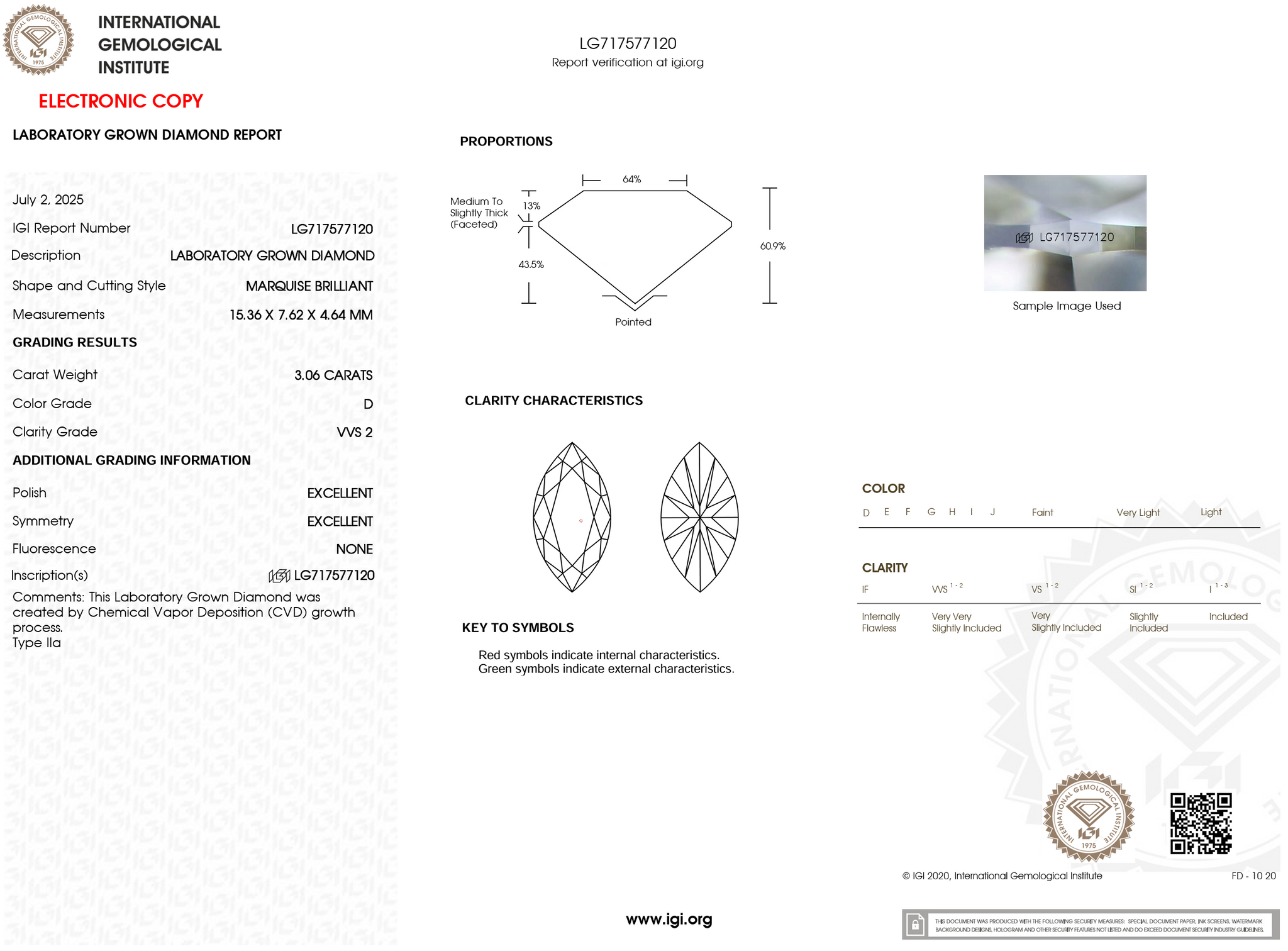 3.06 Carat D-VVS2 Marquise Lab Grown Diamond - IGI (#121515)