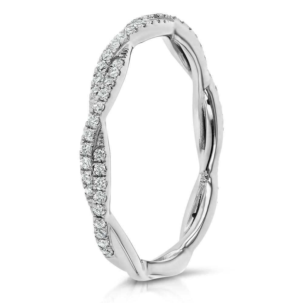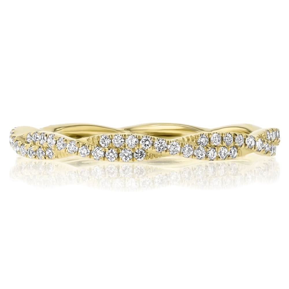 This 2.1mm Braided Diamond Ring is the perfect addition to any bride's wedding ring stack. Made with all pavé round diamonds, this ring sparkles and shines with every movement. The braided design adds a unique and elegant touch to this stackable ring. Wear it alone or stack it with other bands for a customized look. Made with high-quality diamonds and crafted to perfection, this ring will become a cherished piece in your jewelry collection. The ring is perfect for those who like to wear multiple rings or love to stack them. The pavé round diamonds used in the ring are of high quality and sure to add sparkle to your hand. Order now and add a touch of elegance and glamour to your wedding ring stack.