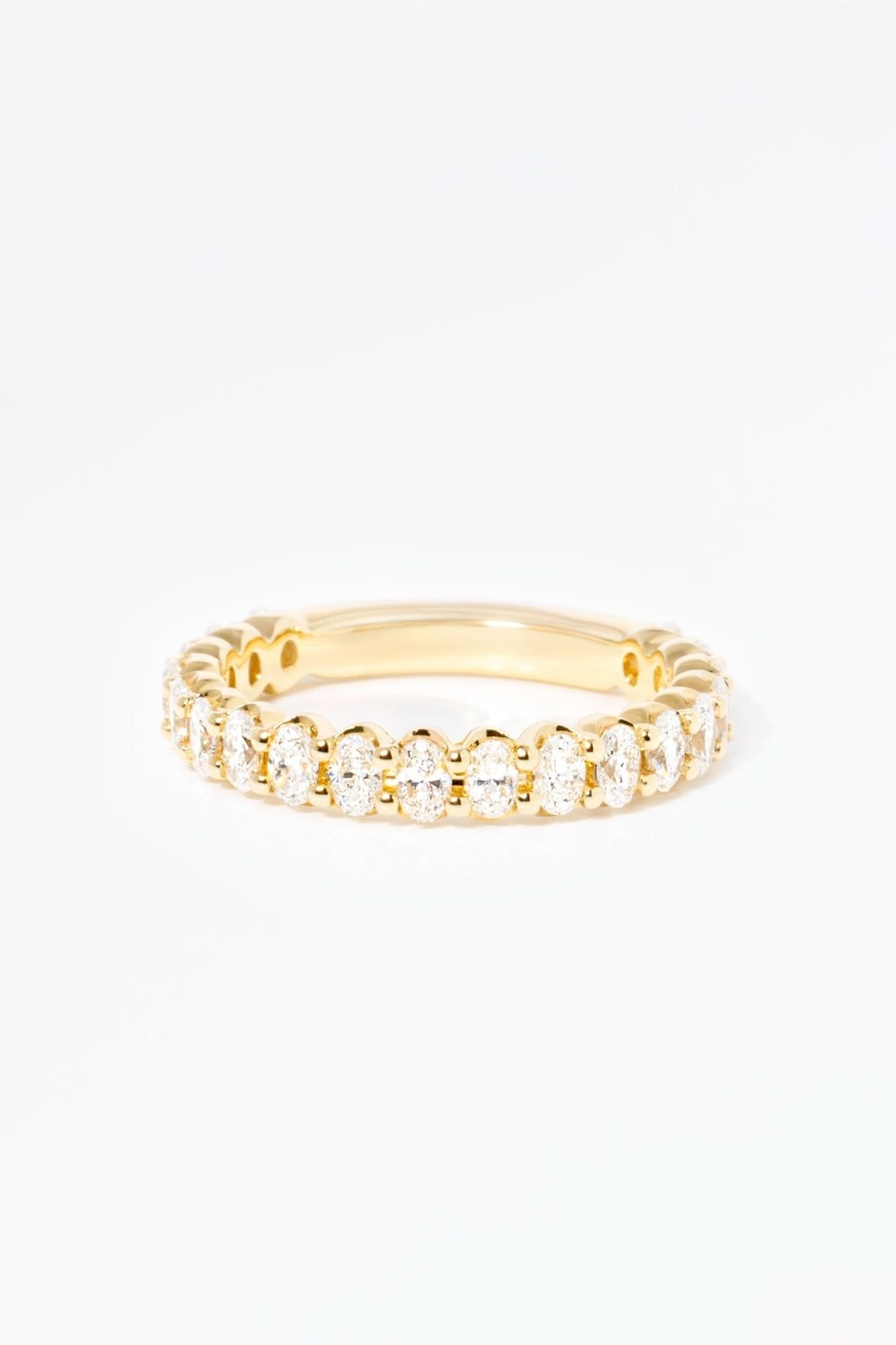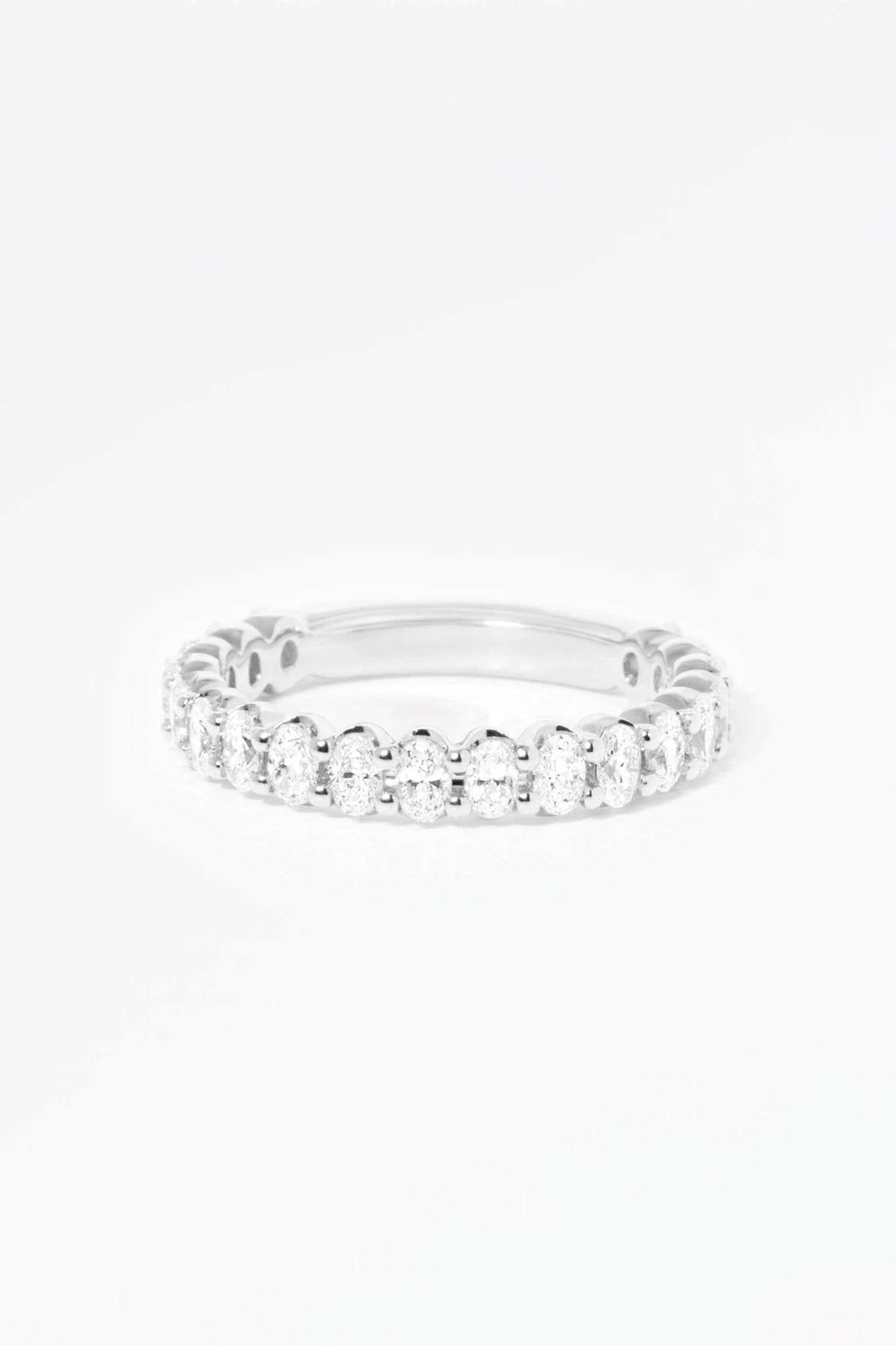 Brilliant mini oval lab diamonds are set northwest with two micro prongs to give you the look of floating oval lab diamonds. This band pairs beautifully with a matching oval engagement ring or makes an impact being worn on its own.