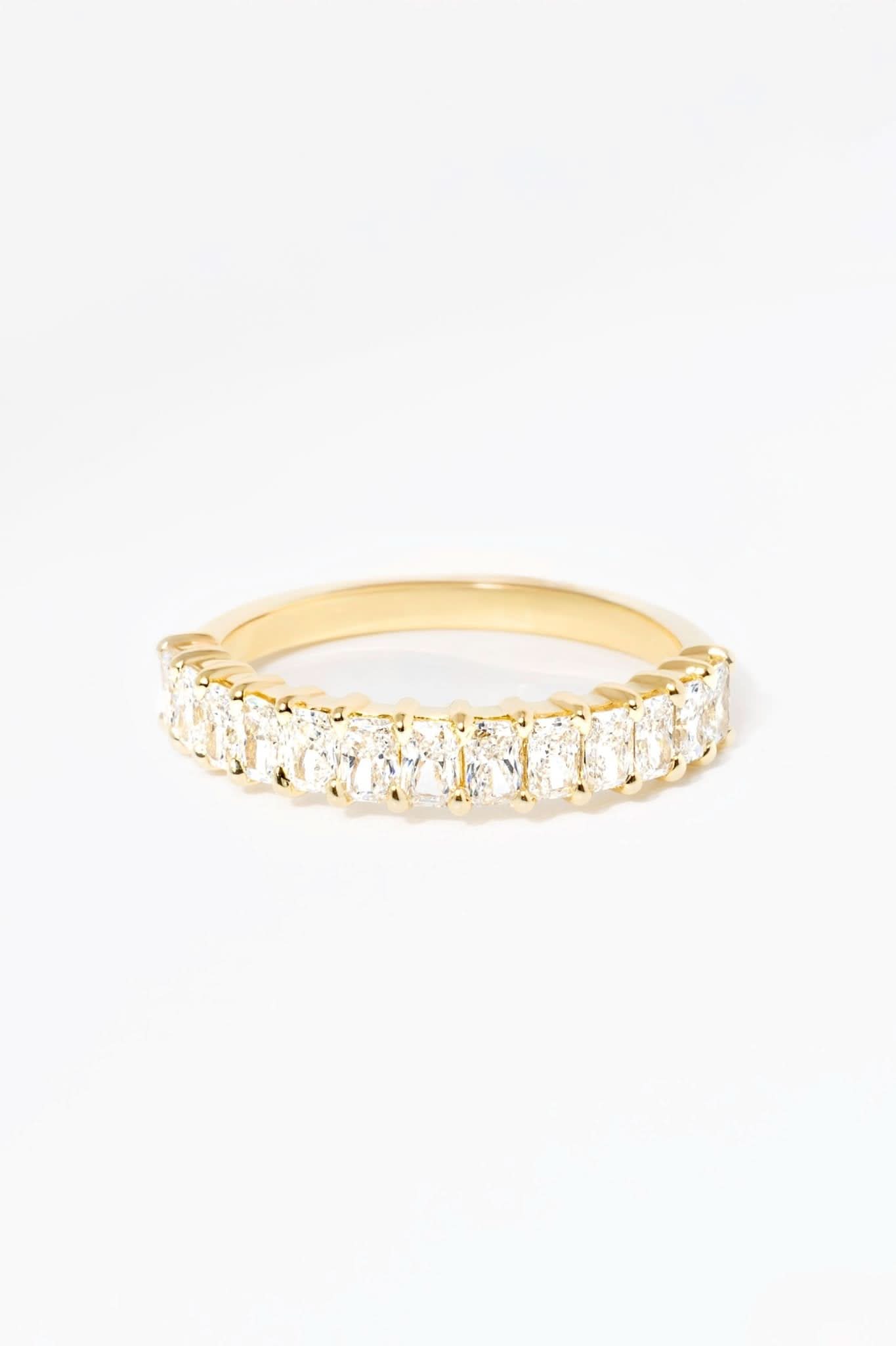 Mini radiant lab diamonds are set northwest with two micro prongs to give you the look of floating oval lab diamonds. This band pairs beautifully with a matching radiant engagement ring or makes an impact being worn on its own.