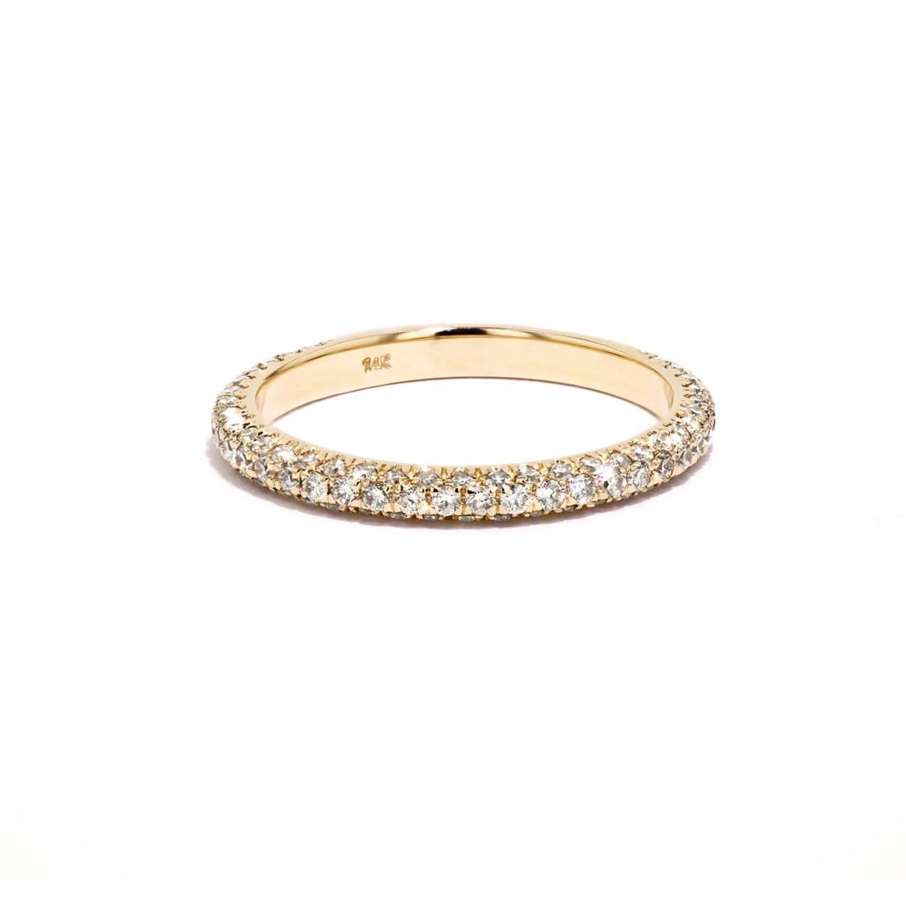 Introducing the 2.2mm Christina 3D Pavé Diamond Ring - the perfect addition to your wedding ring collection. Made with three sides of pavé round diamonds, this delicate stackable ring is a stunning choice for any bride-to-be. The sparkling diamonds are set in a unique 3D design, creating a mesmerizing effect that will capture the attention of anyone who sees it. The ring is crafted with the highest quality materials, ensuring that it is both durable and comfortable to wear. The dainty design of the ring makes it perfect for stacking with other bands, allowing you to create a personalized look that is truly unique. Whether you are looking for a wedding ring or a special piece of jewelry to add to your collection, the Christina 3D Pavé Diamond Ring is sure to impress.