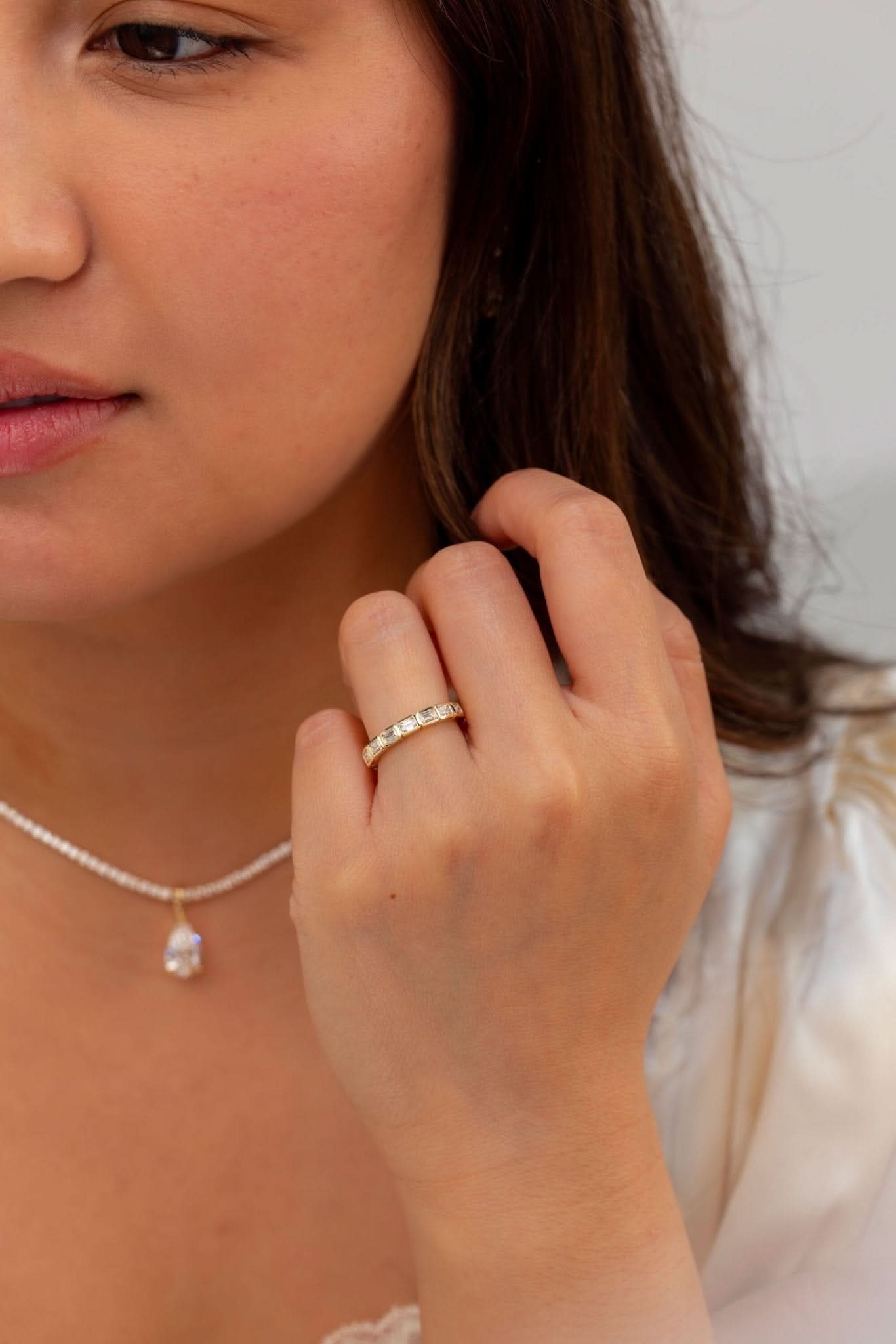 Designed for those who love modern elegance, the East-West Emerald Floating Diamond Ring is a refined take on a classic diamond ring, perfect for everyday luxury.