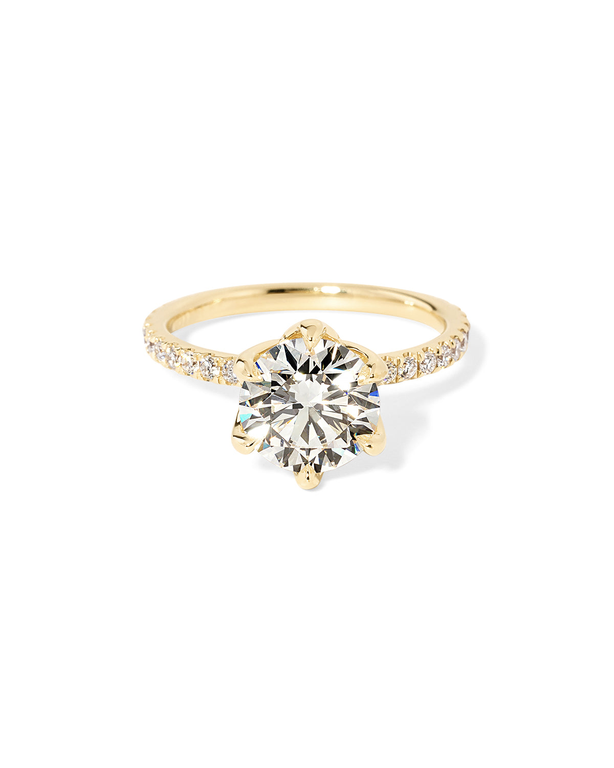 The Caraline, our signature petal-prong engagement ring, is inspired by the delicate petals of a lotus flower. This elegant design features a graceful petal-prong setting that beautifully frames the center stone, paired with a sparkling pavé diamond band for added brilliance. Finished with a rounded, comfort-fit band, Caraline is crafted for both beauty and everyday wear—timeless, romantic, and effortlessly refined.