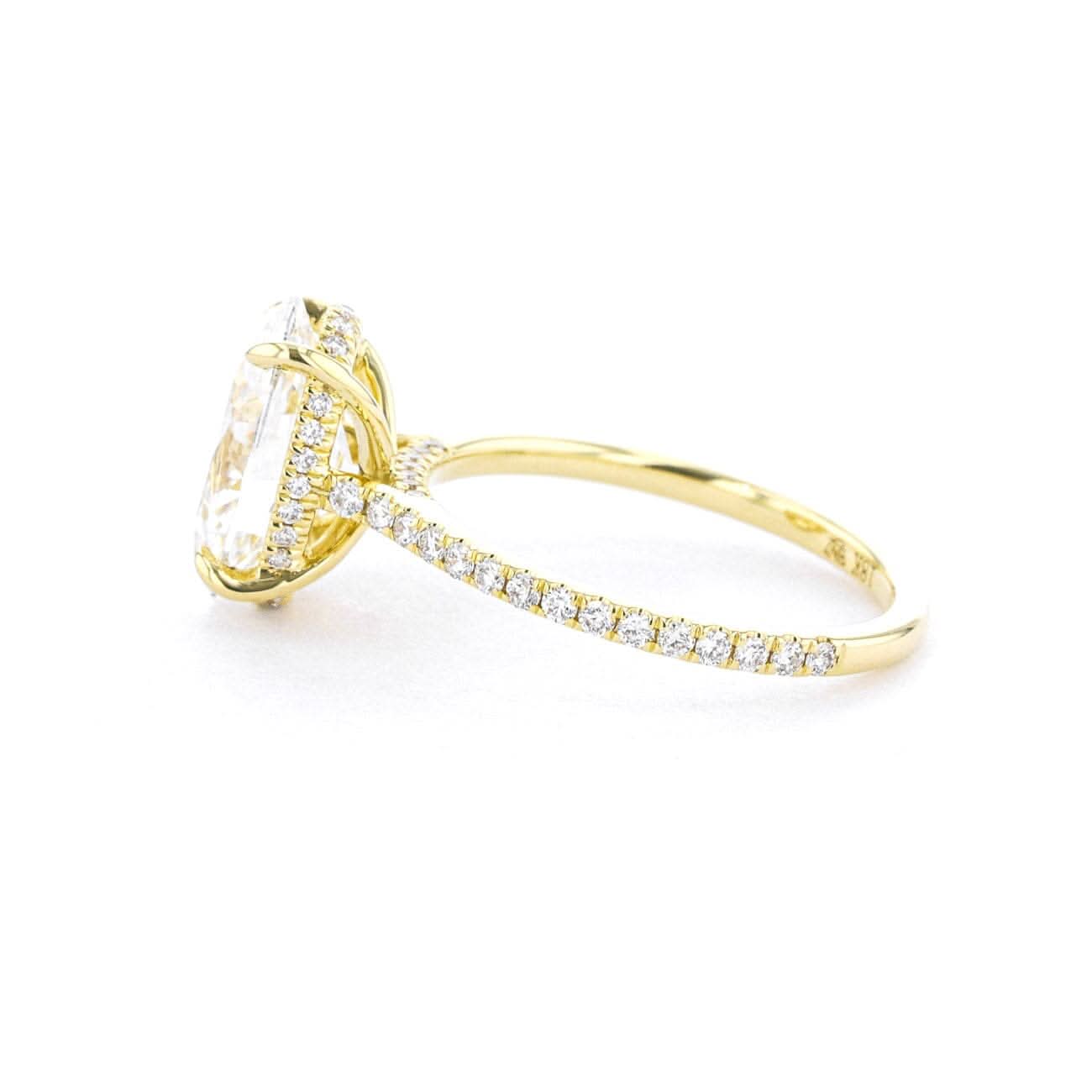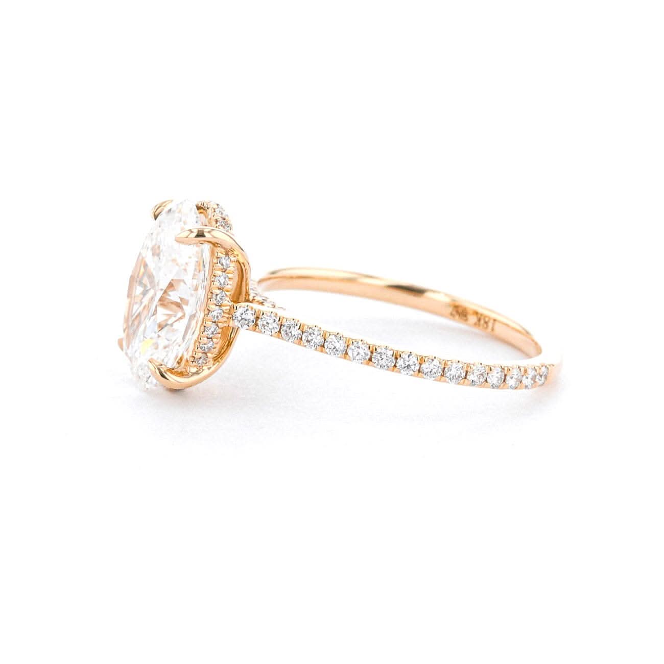 ✦ Hidden Halo: A band with diamonds set into it that goes underneath the center stone and sits between the prongs. This style works best for rounded diamond shapes. It can only be seen from the side, not the top, and is slightly more recessed under the stone.