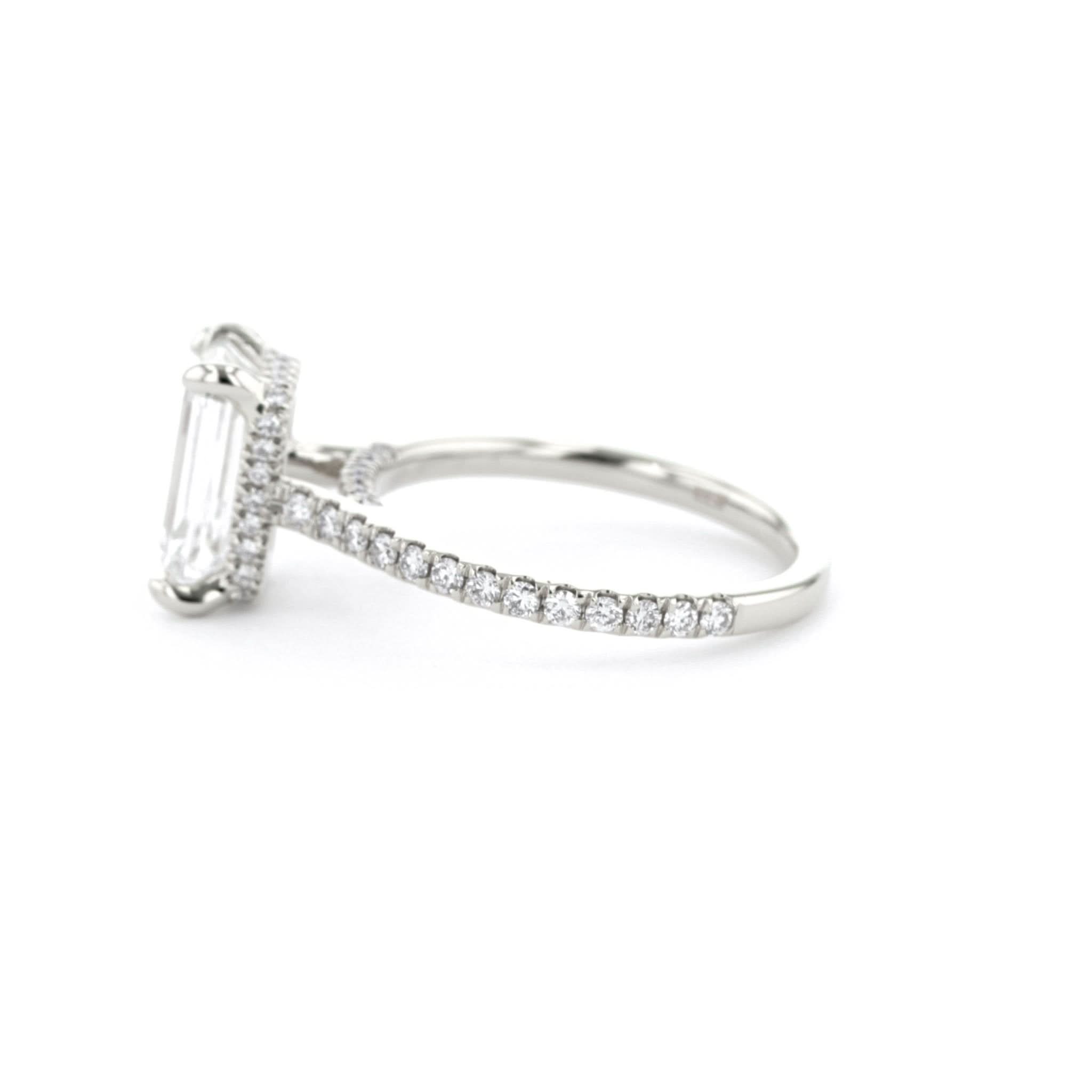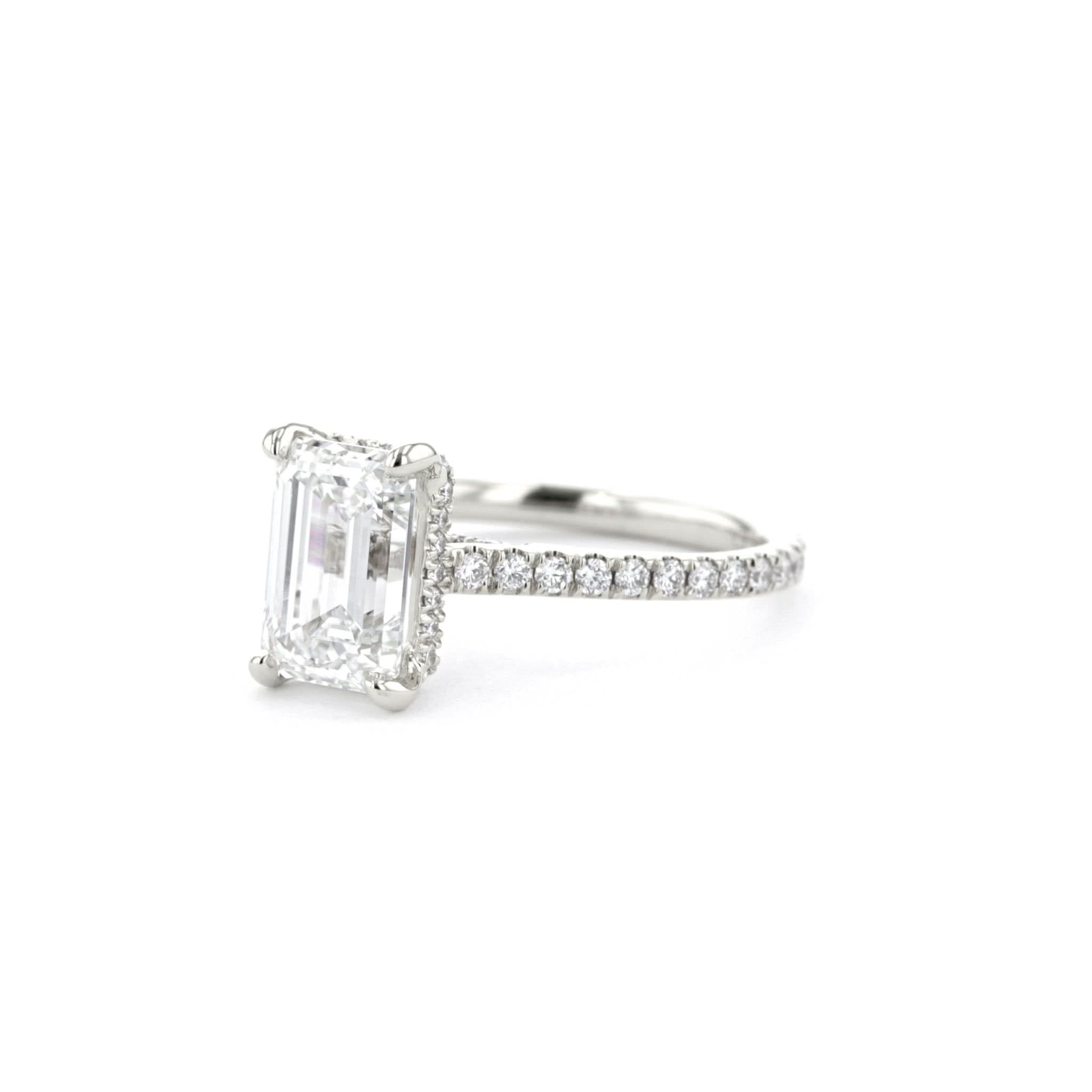 ✦ Under Halo: A band with diamonds set into it that goes underneath the center stone and wraps around the outside of the prongs. This wrap-style pavé under halo more distinctly matches the shape of the center stone and lends itself best to square or unique diamond shapes, such as heart shapes. This under halo is easier to see than a hidden halo but can only be seen from the side, not the top.