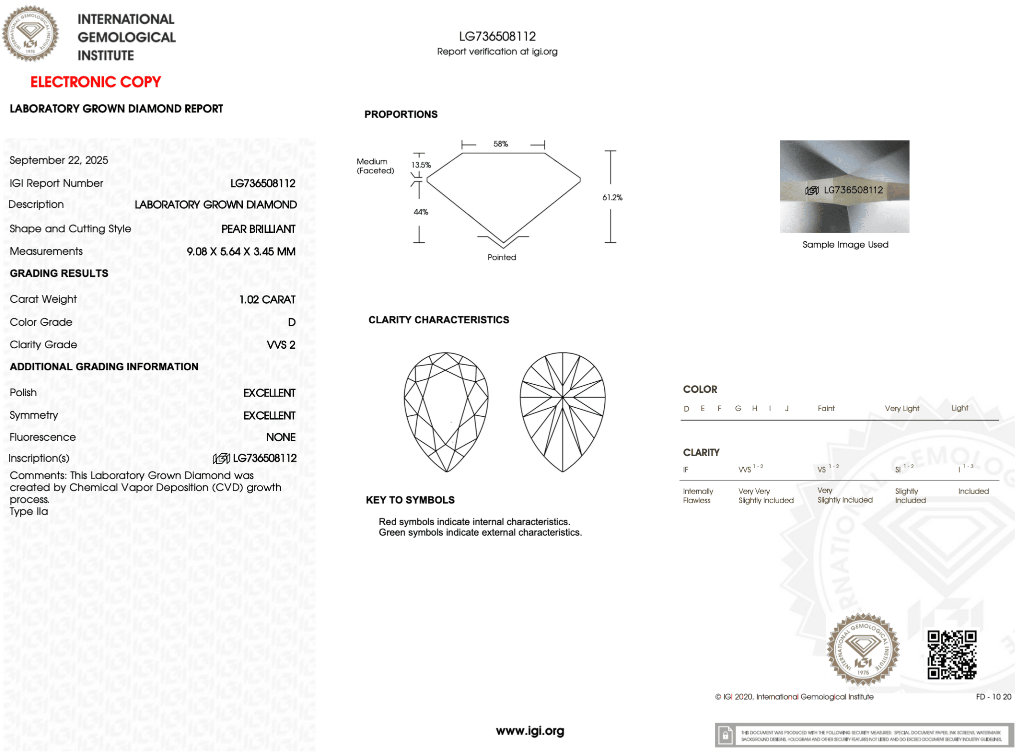 1.02 Carat D-VVS2 Pear Lab Grown Diamond - IGI (#122016)