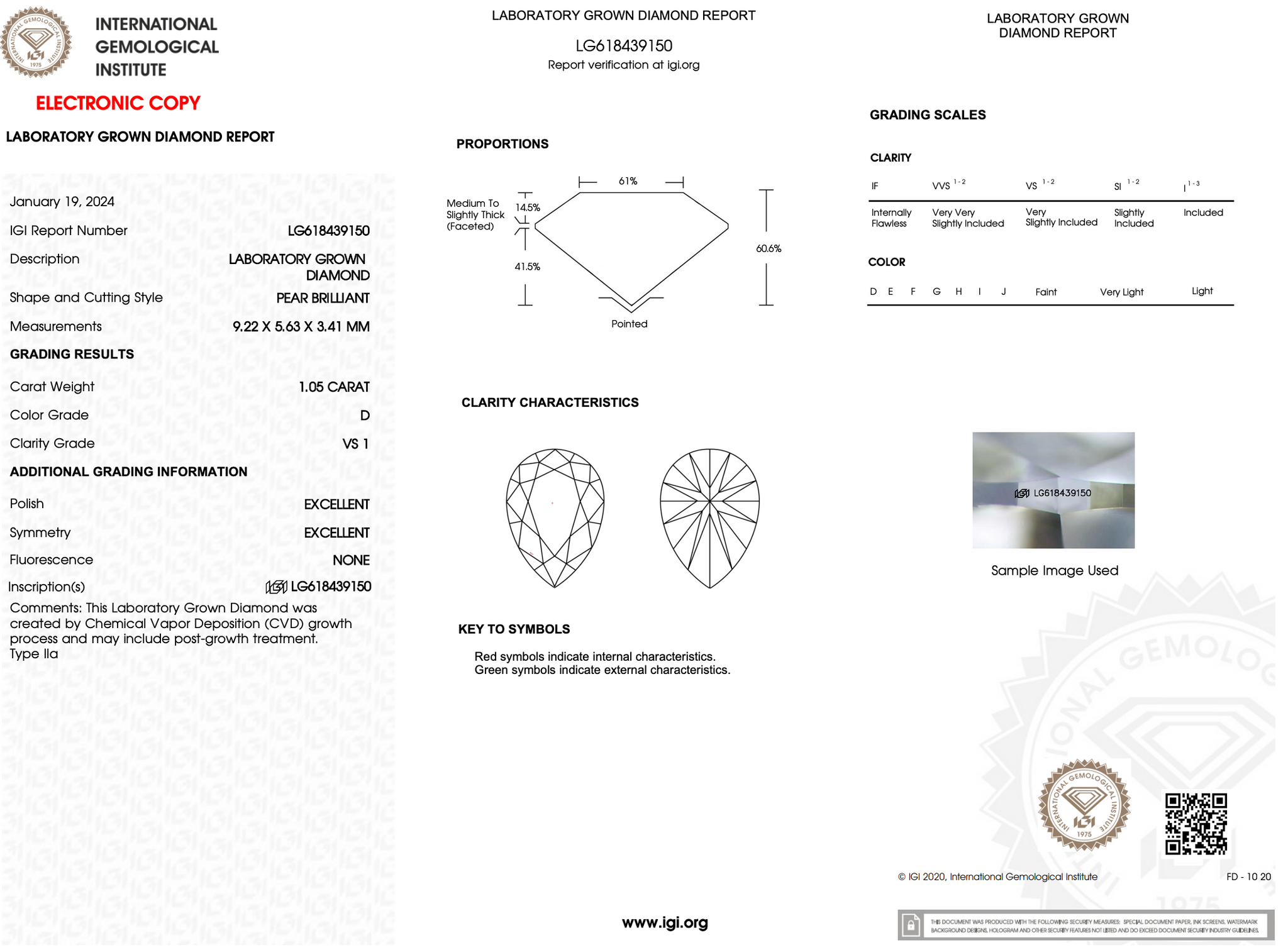 1.05 Carat D-VS1 Pear Lab Grown Diamond - IGI (#122009)