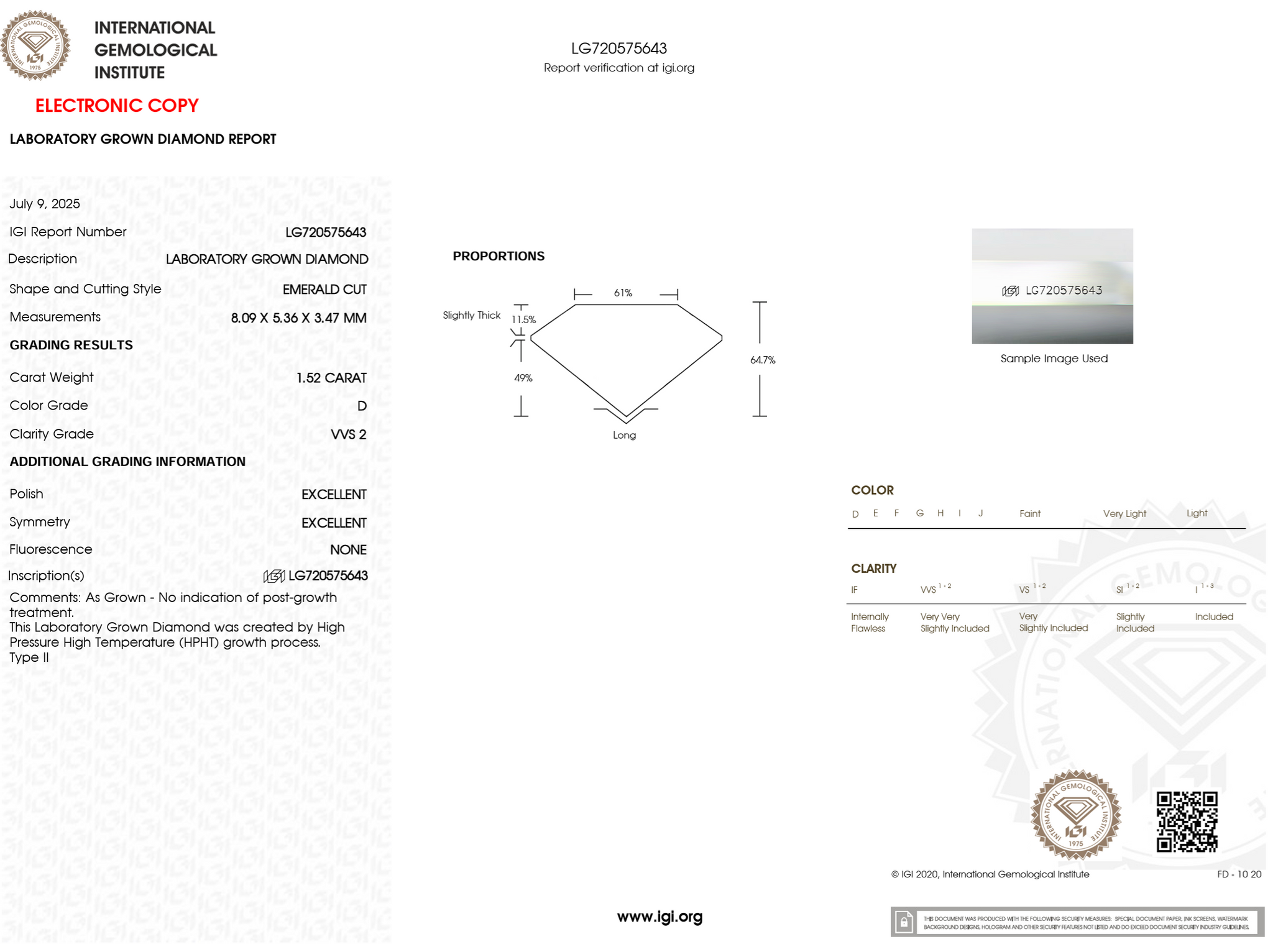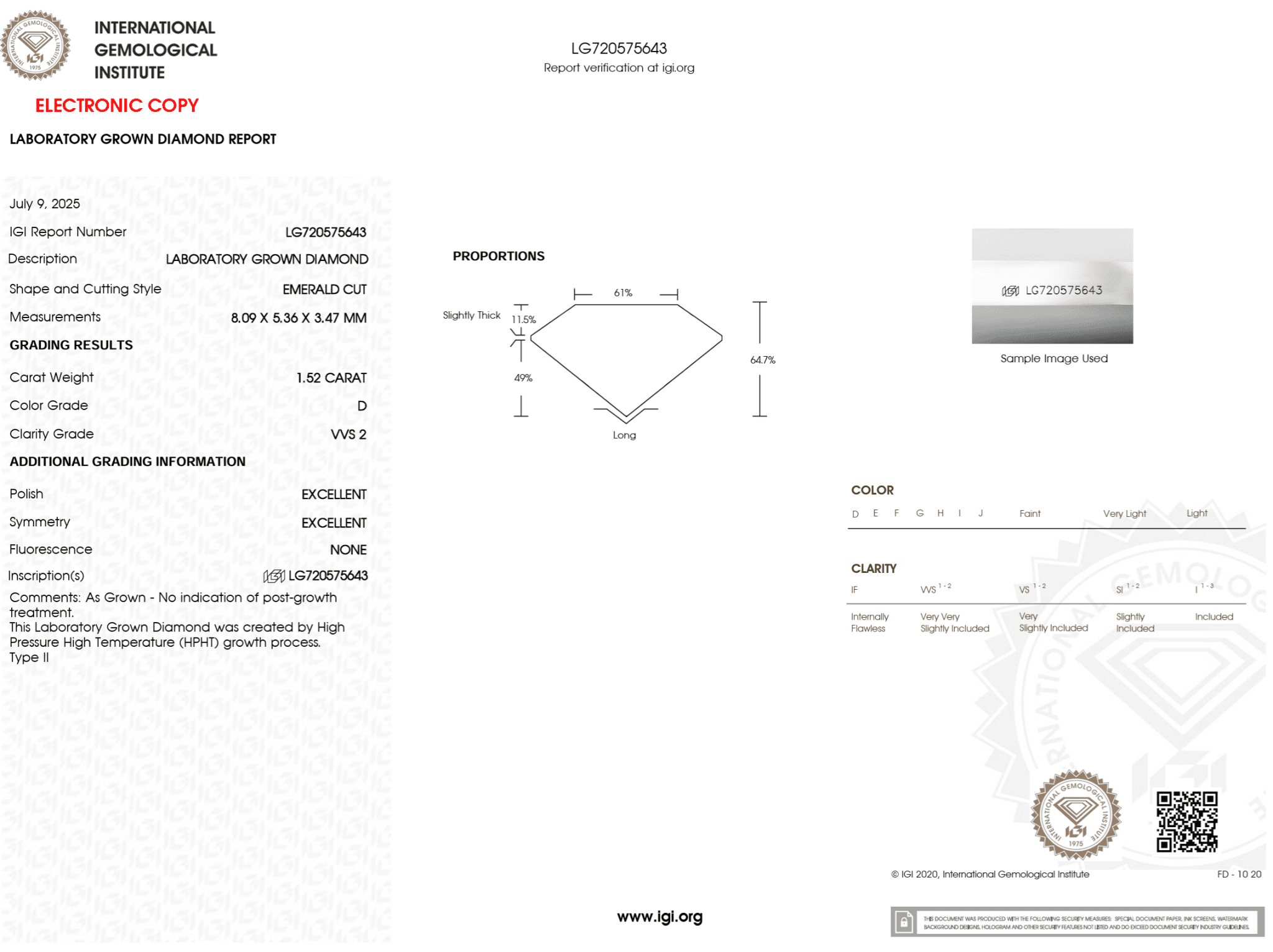 1.52 Carat D-VVS2 Emerald Lab Grown Diamond - IGI (#123393)
