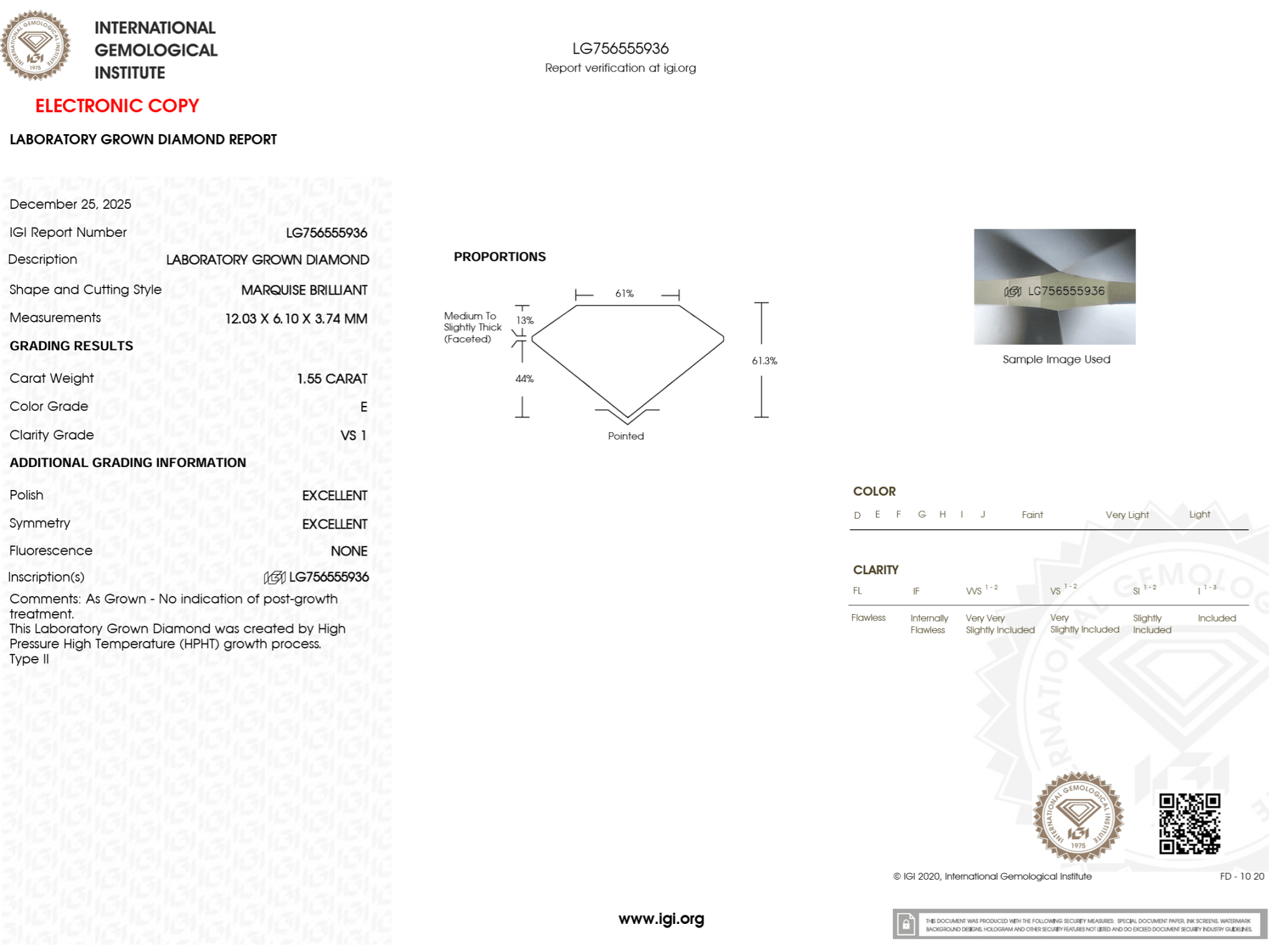 1.55 Carat E-VS1 Marquise Lab Grown Diamond - IGI (#124051)