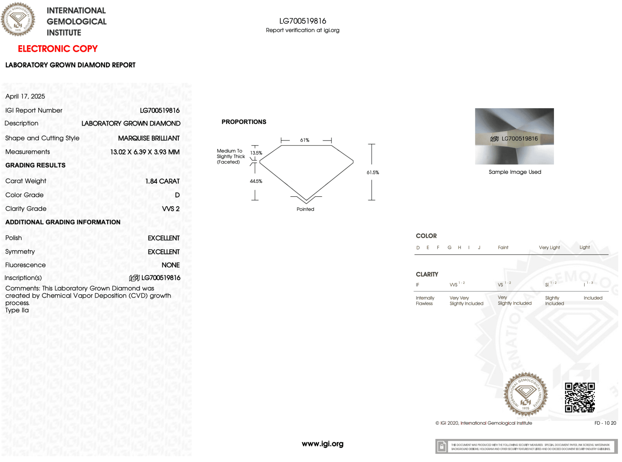 1.84 Carat D-VVS2 Marquise Lab Grown Diamond - IGI (#121904)