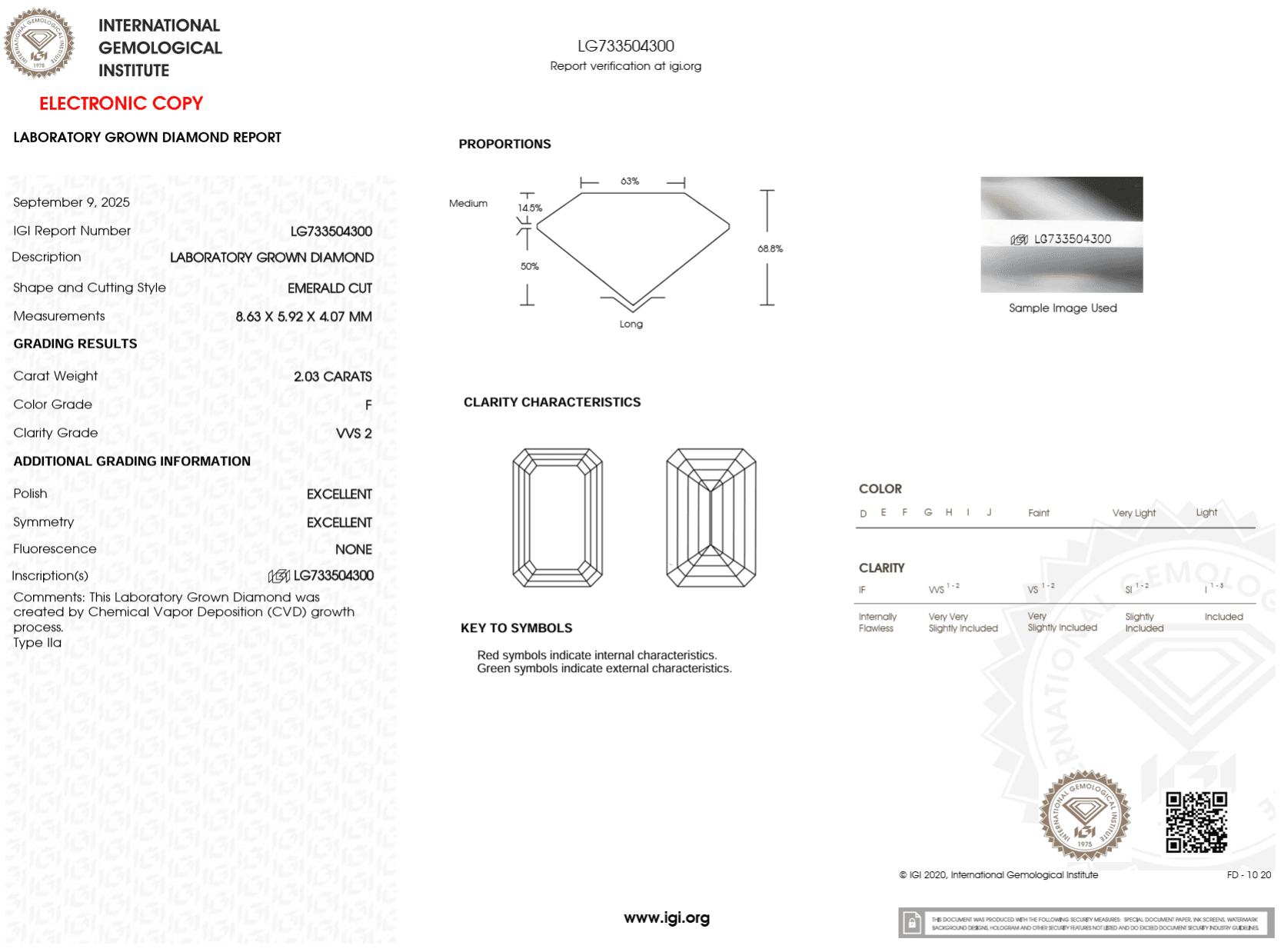 2.03 Carat F-VVS2 Emerald Lab Grown Diamond - IGI (#122823)