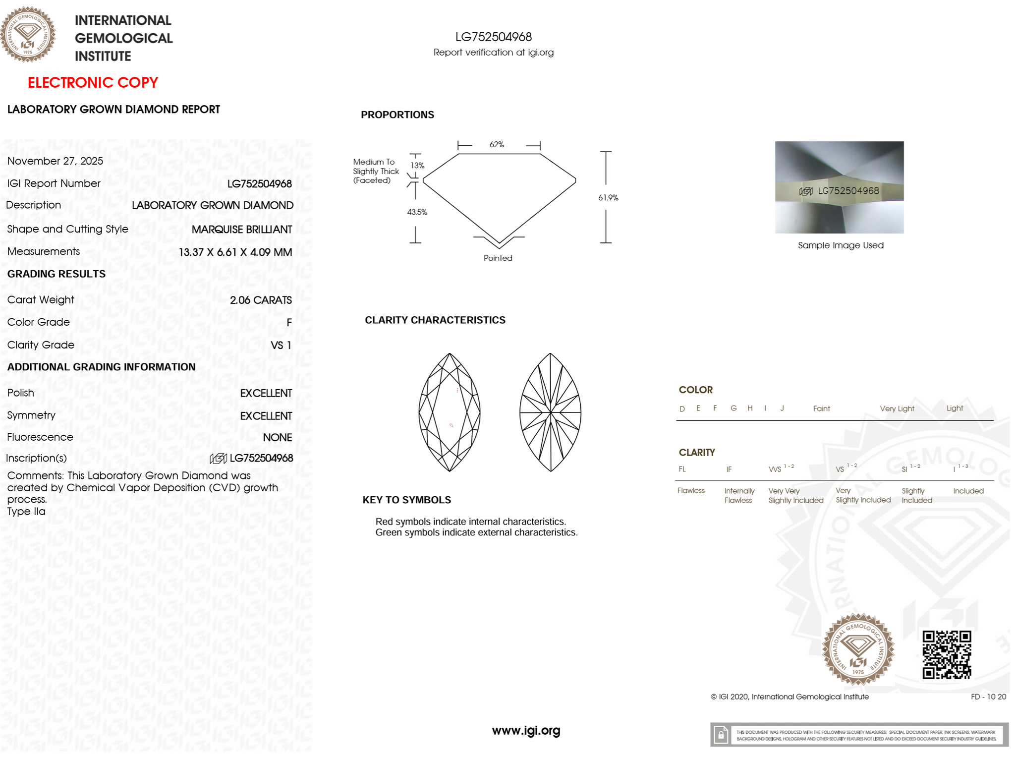 2.06 Carat F-VS1 Marquise Lab Grown Diamond - IGI (#123480)