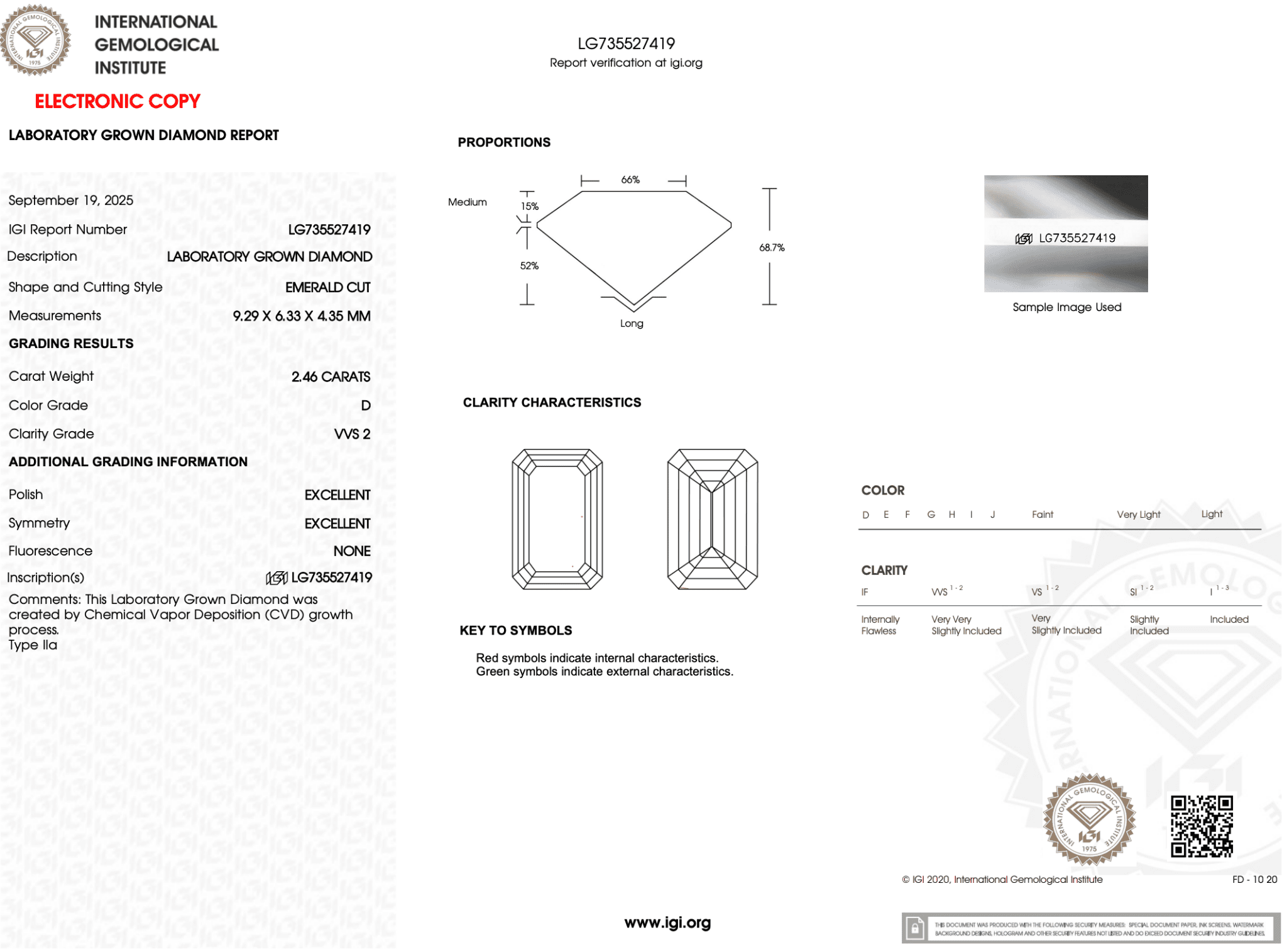 2.46 Carat D-VVS2 Emerald Lab Grown Diamond - IGI (#121968)