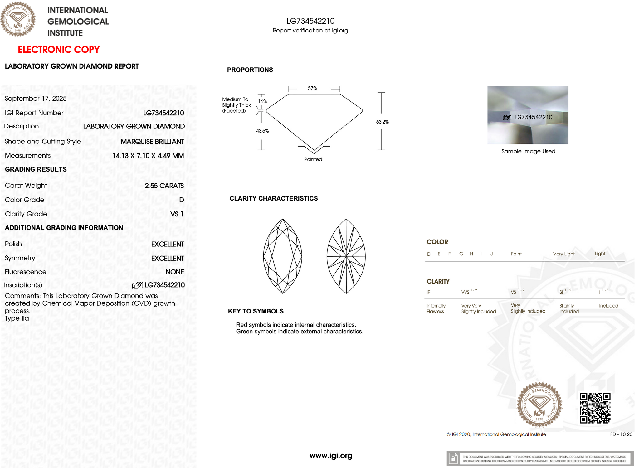 2.55 Carat D-VS1 Marquise Lab Grown Diamond - IGI (#121911)