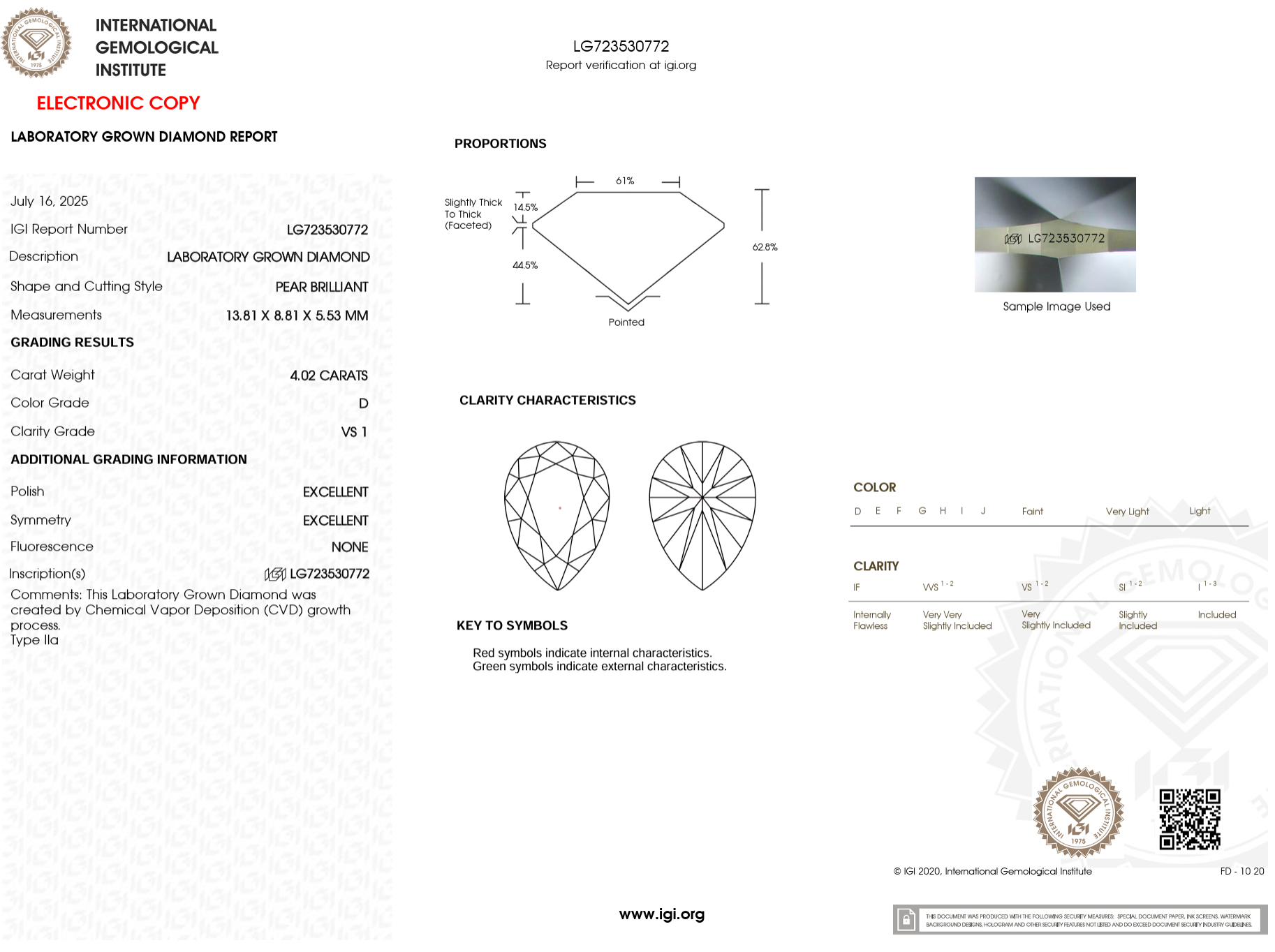 4.02 Carat D-VS1 Pear Lab Grown Diamond - IGI (#121787)