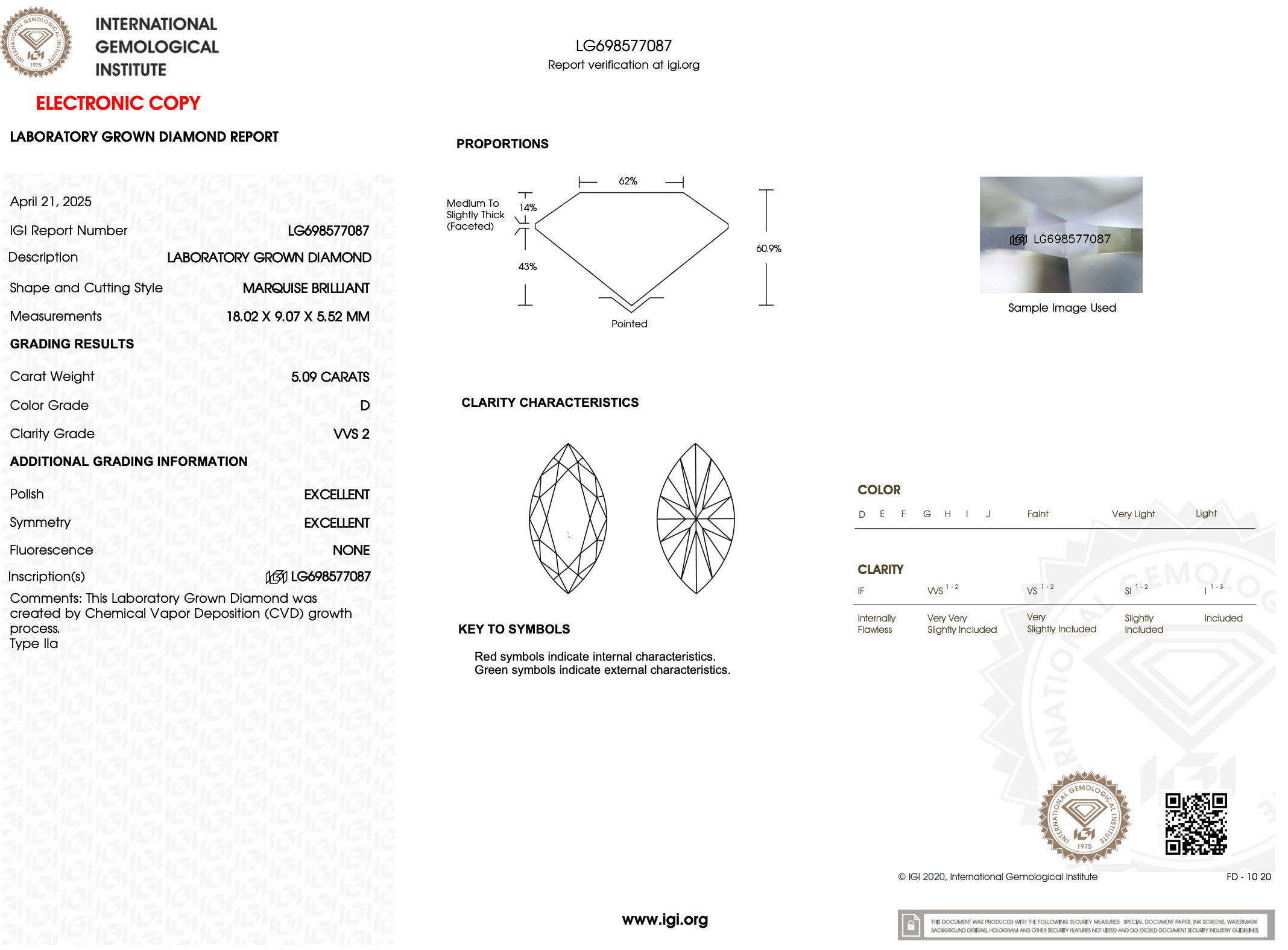 5.09 Carat D-VVS2 Marquise Lab Grown Diamond - IGI (#122003)