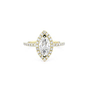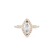 The Leilani features a classic pavé band with a delicate seamless classic halo, traditional-style body, and diamond lotus petal prongs.