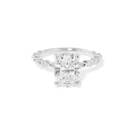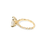The Rei features a floating diamond band of marquise and round diamonds with a hidden inner under halo