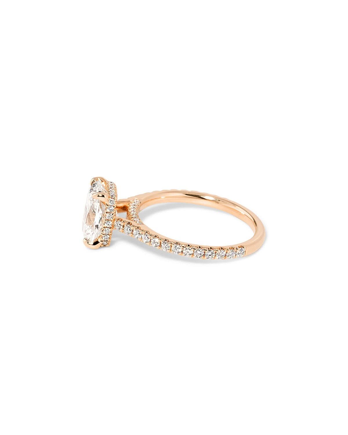 ✦ Under Halo: A band with diamonds set into it that goes underneath the center stone and wraps around the outside of the prongs. This wrap-style pavé under halo more distinctly matches the shape of the center stone and lends itself best to square or unique diamond shapes, such as heart shapes. This under halo is easier to see than a hidden halo but can only be seen from the side, not the top.