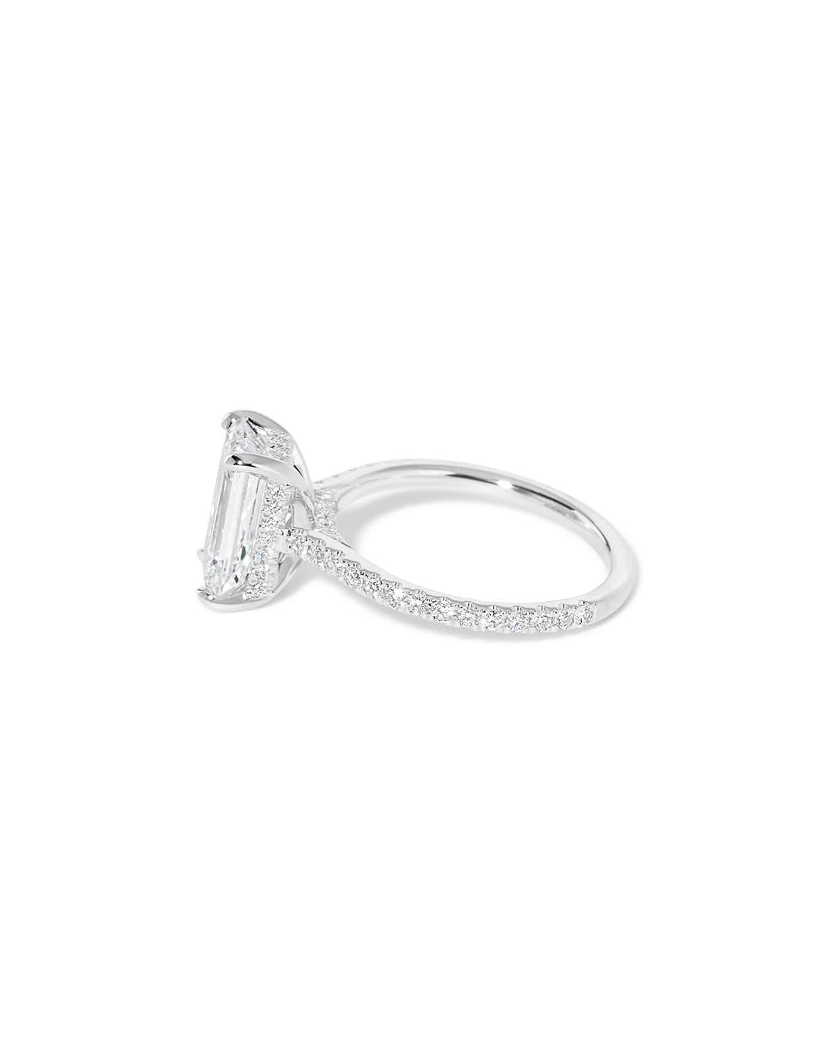 The Alice features a classic pavé band that adds timeless sparkle, paired with a graceful cathedral-style body for an elevated, elegant profile. Beneath the center stone, a hidden inner under-halo offers subtle detail, while a diamond bridge completes the design with beautiful brilliance from every angle.