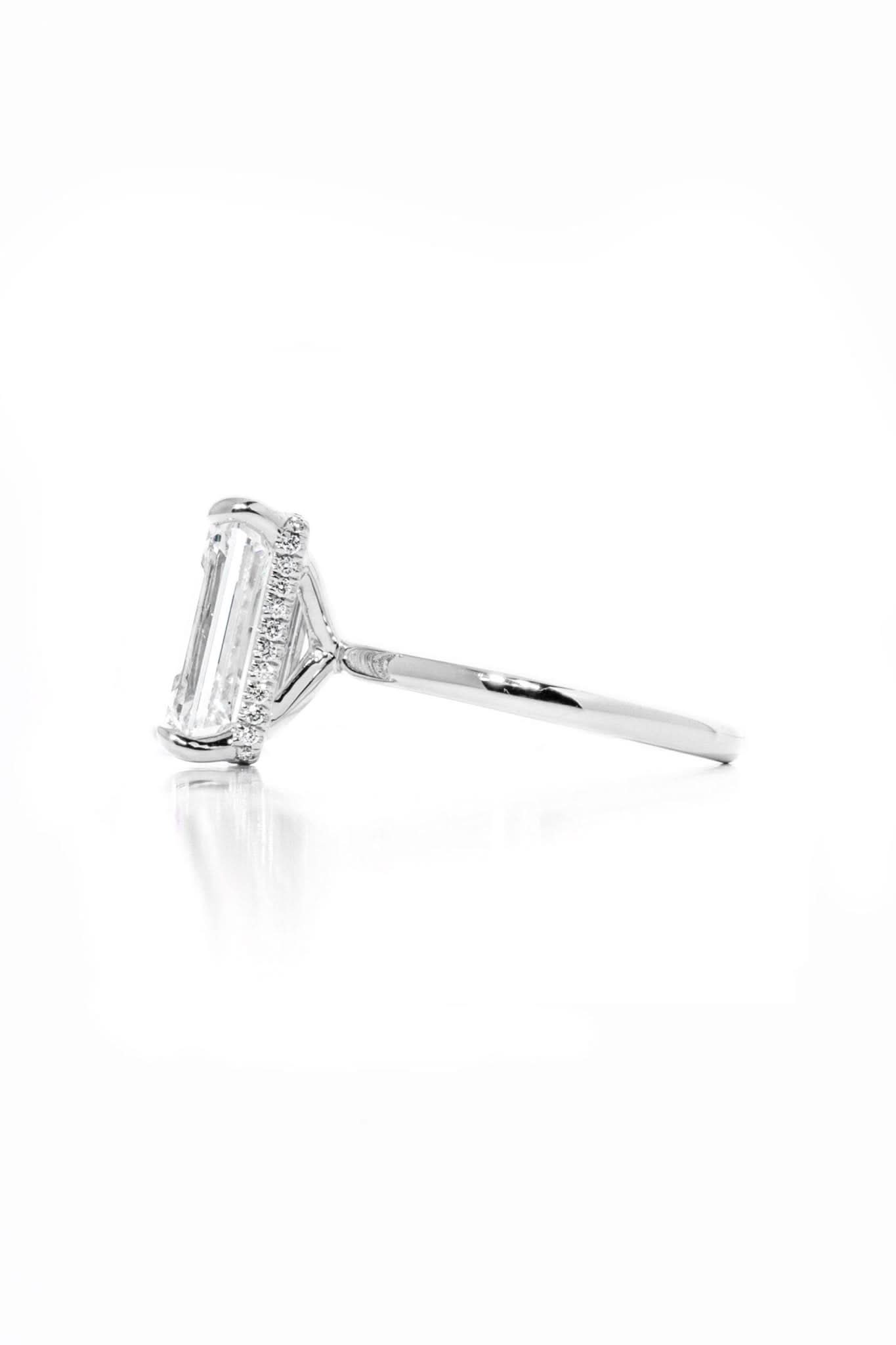 ✦ Under Halo: A band with diamonds set into it that goes underneath the center stone and wraps around the outside of the prongs. This wrap-style pavé under halo more distinctly matches the shape of the center stone and lends itself best to square or unique diamond shapes, such as heart shapes. This under halo is easier to see than a hidden halo but can only be seen from the side, not the top.