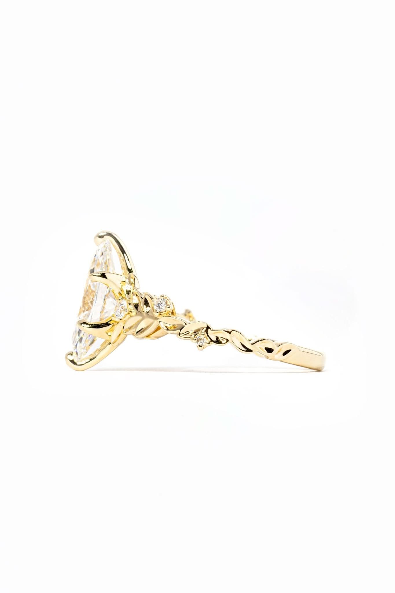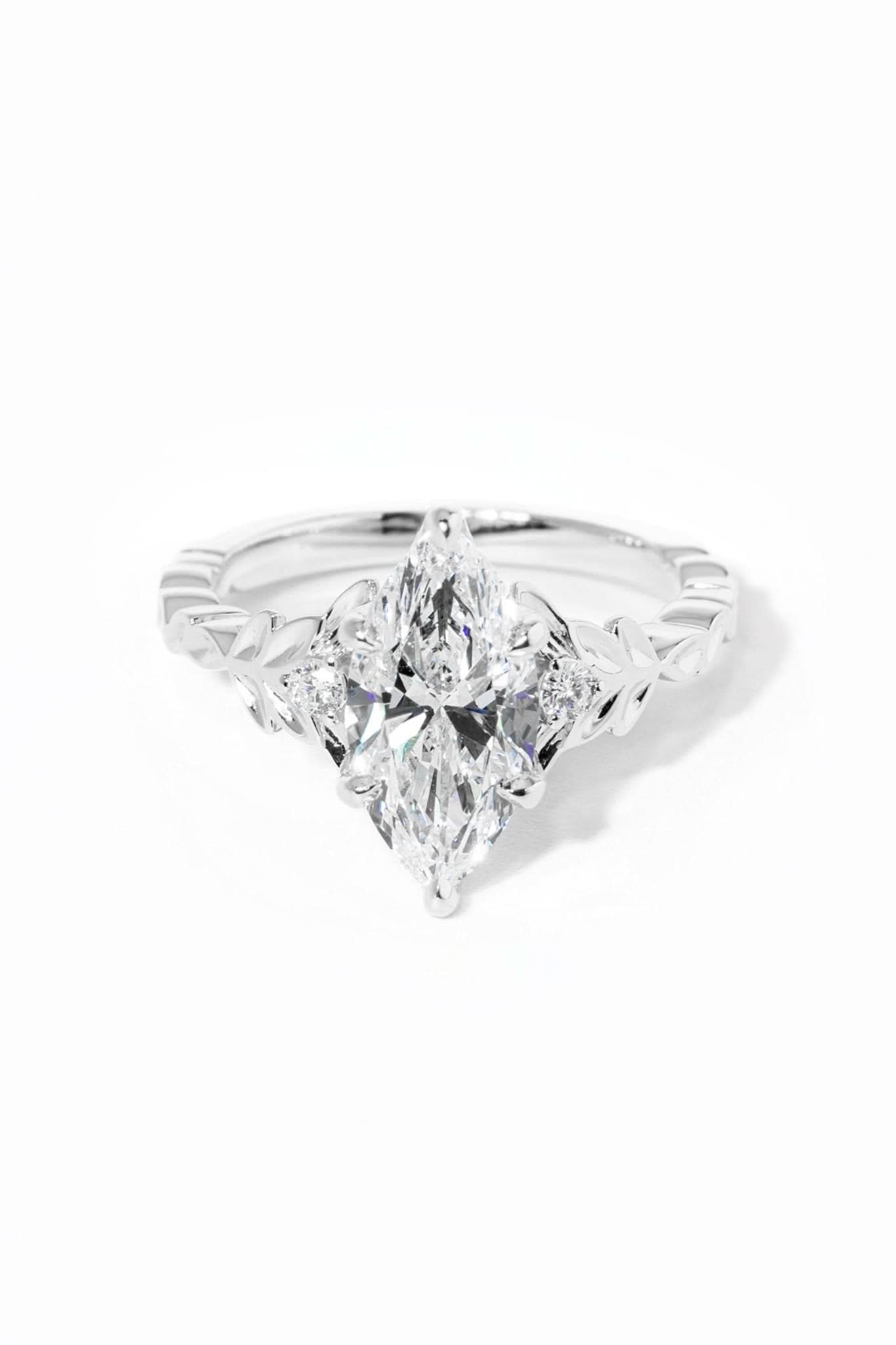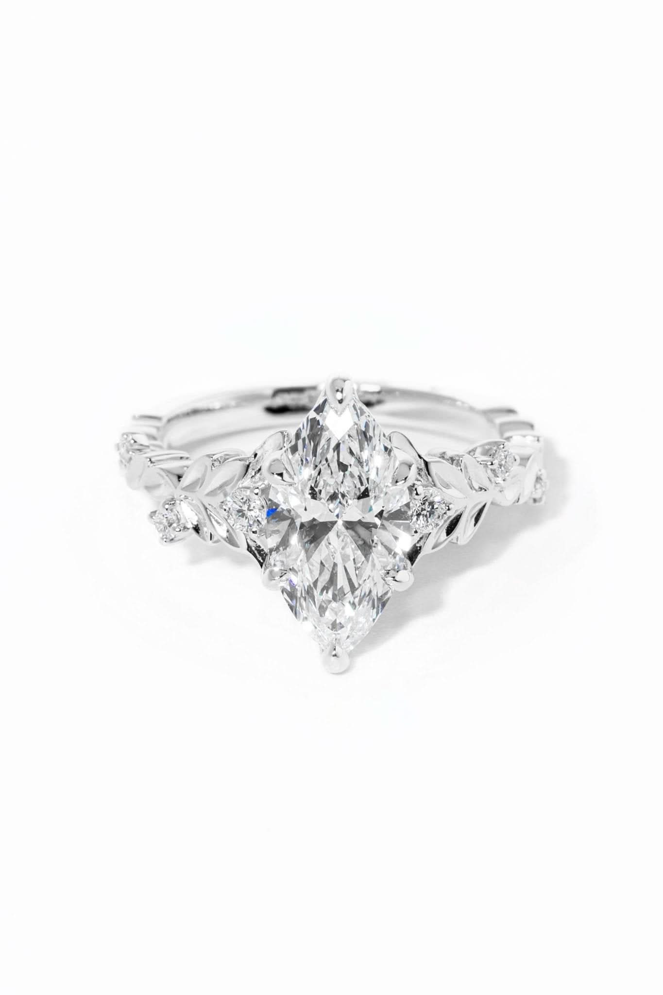 The Arwen exudes a nature-inspired aesthetic with delicate leaves gracefully climbing the band, adorned with sparkling diamonds scattered throughout.