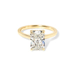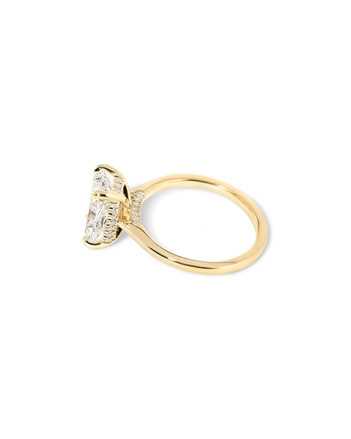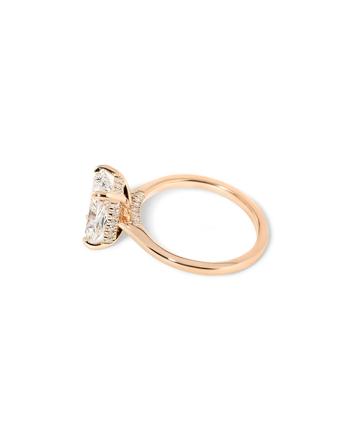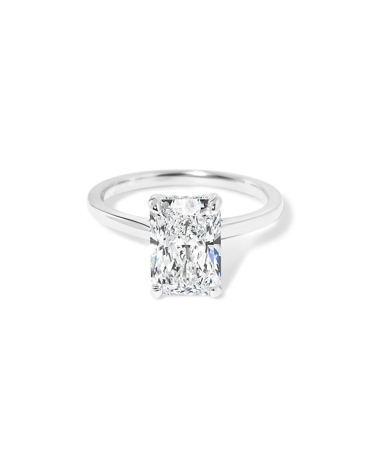 The Alice features a high polish comfort fit band with a hidden inner under halo and a cathedral-style body with a diamond bridge.