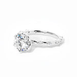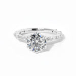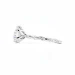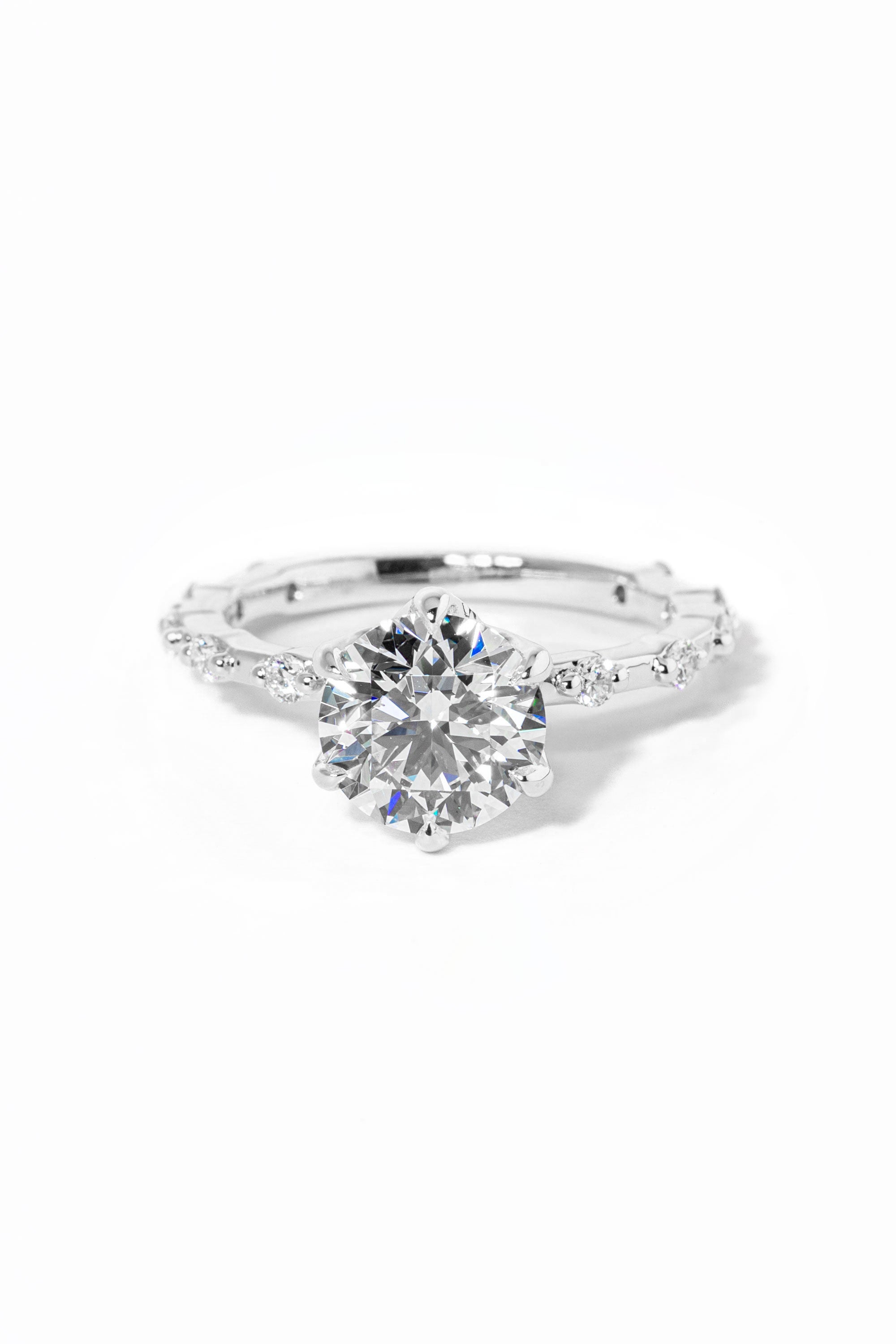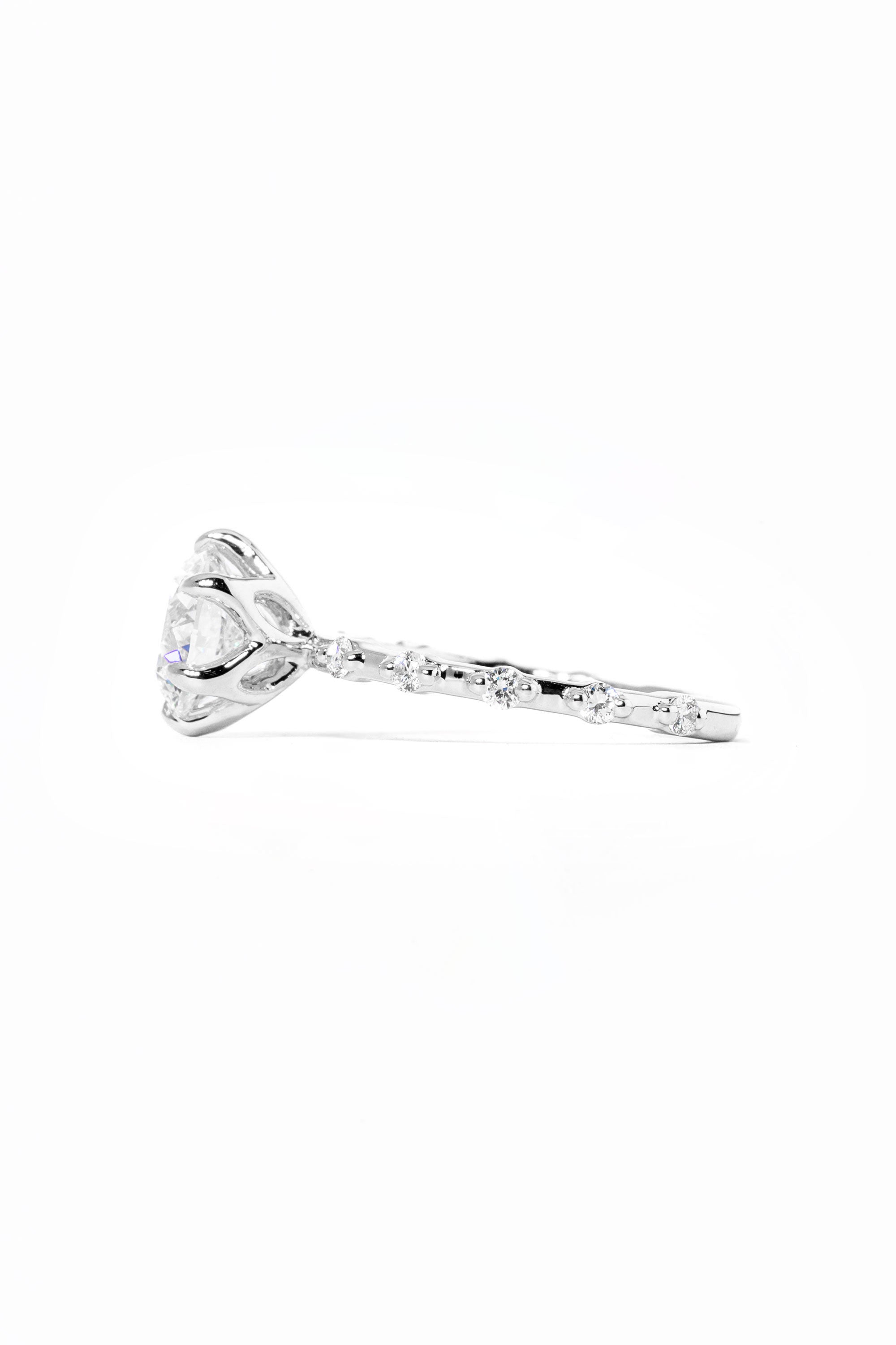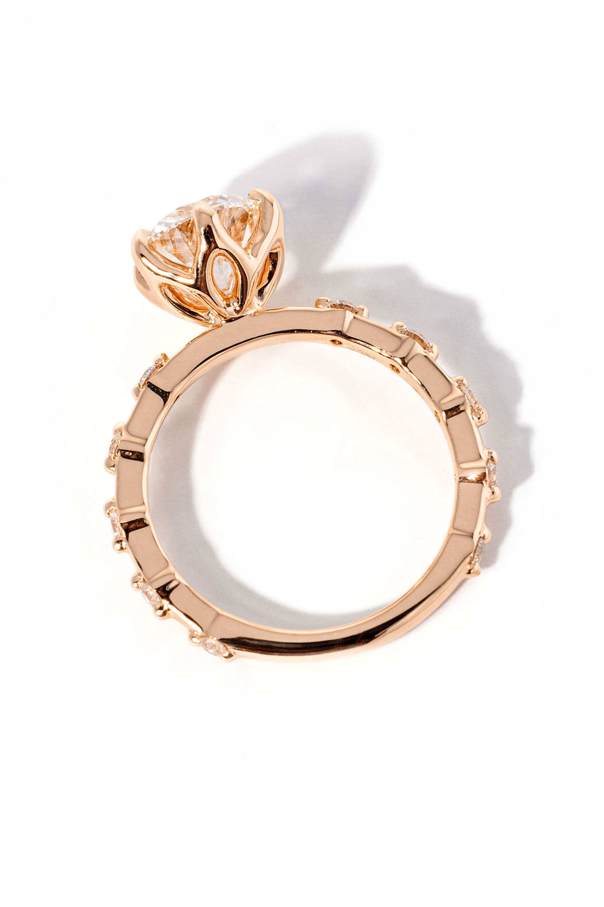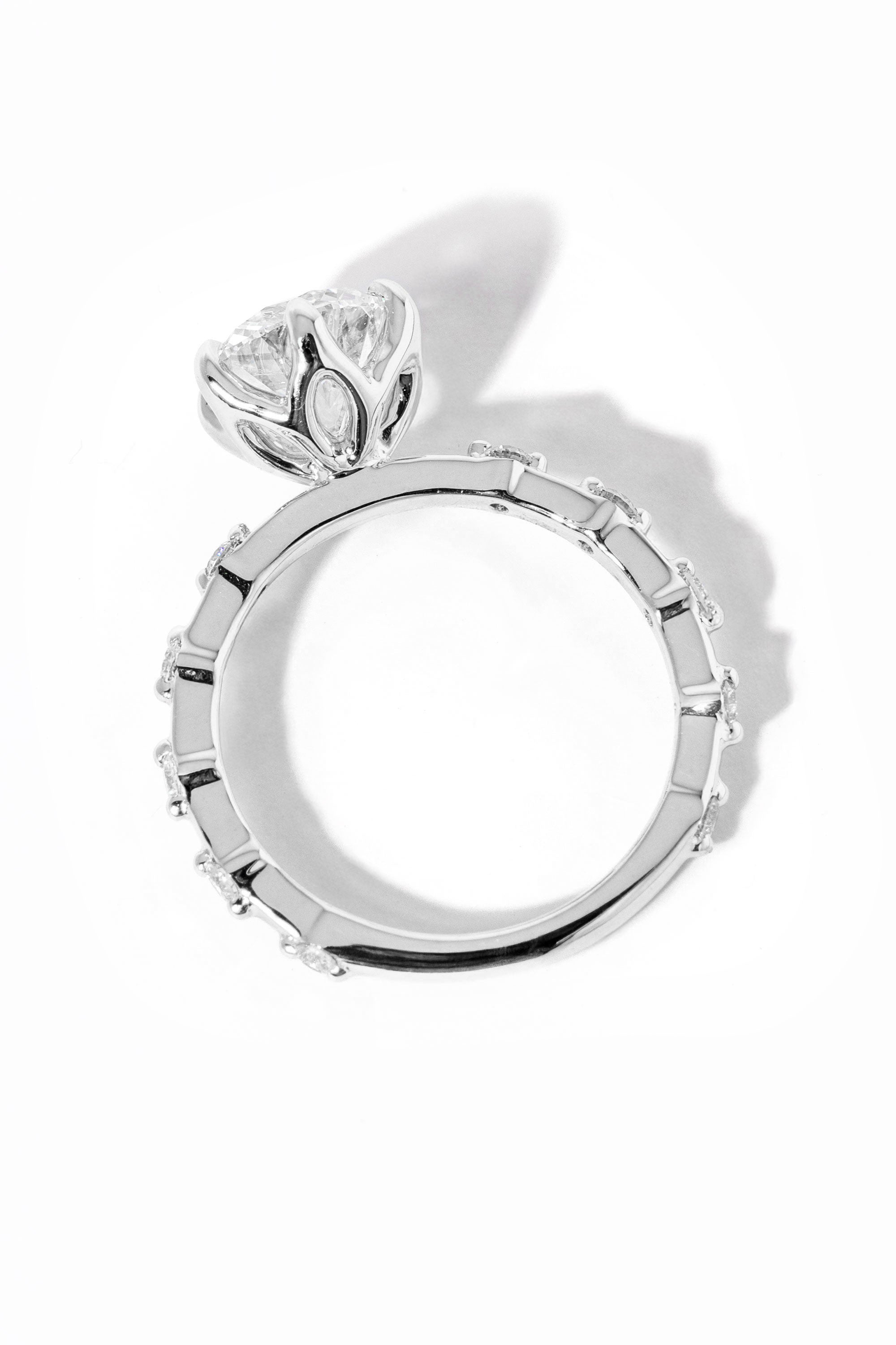 The Lila features delicately spaced diamonds on a solid gold band in the metal color of your choice with high polish lotus petal prongs.