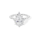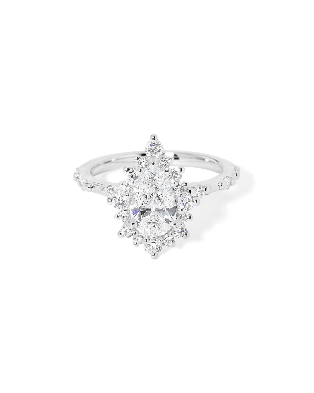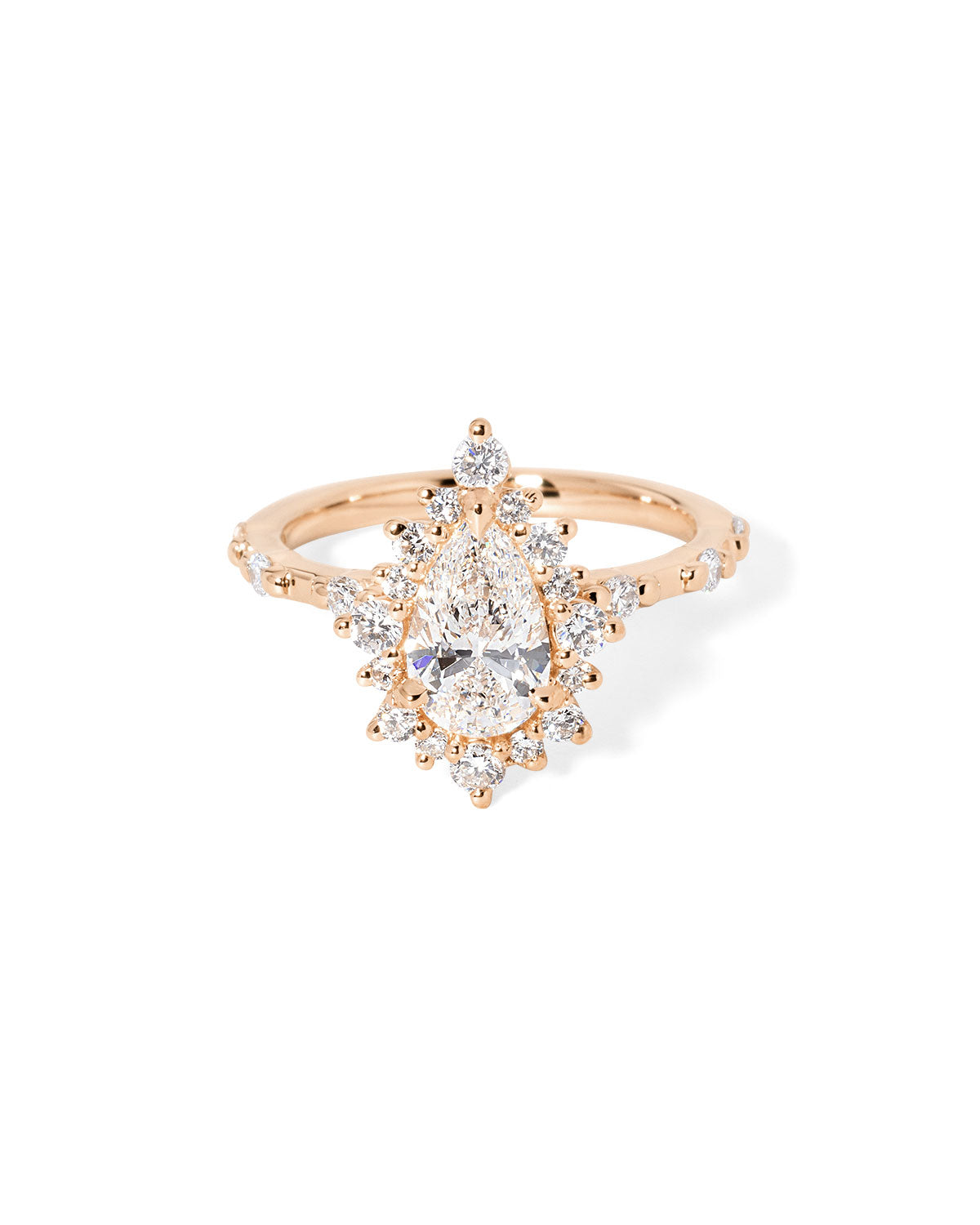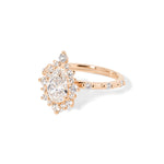 The Kaia is a unique vintage-inspired design, showcasing a solid gold band adorned with delicately spaced diamonds in your chosen metal hue. Enhanced by an intricate halo of alternating round diamonds, this piece masterfully merges timeless elegance with detailed craftsmanship. Experience the allure of the past crafted for the modern woman.