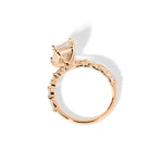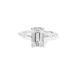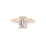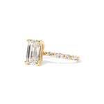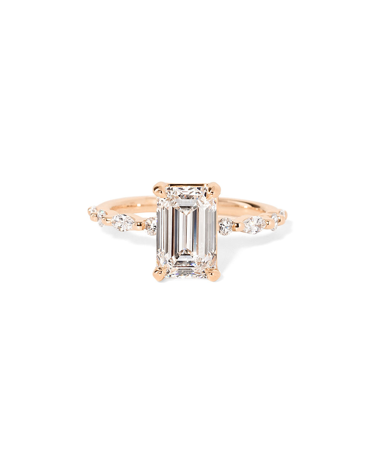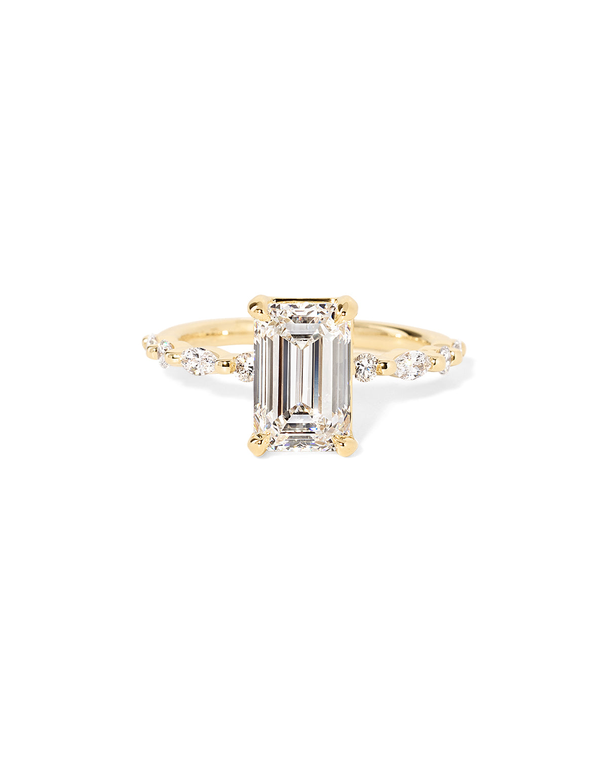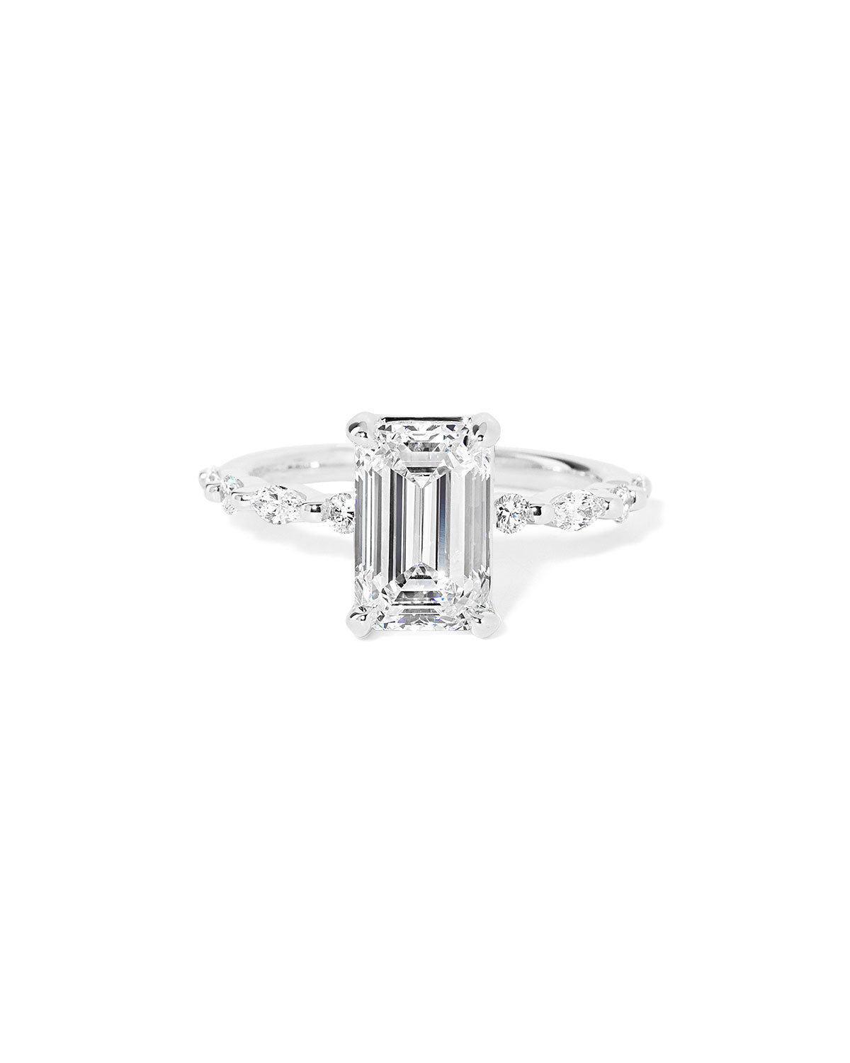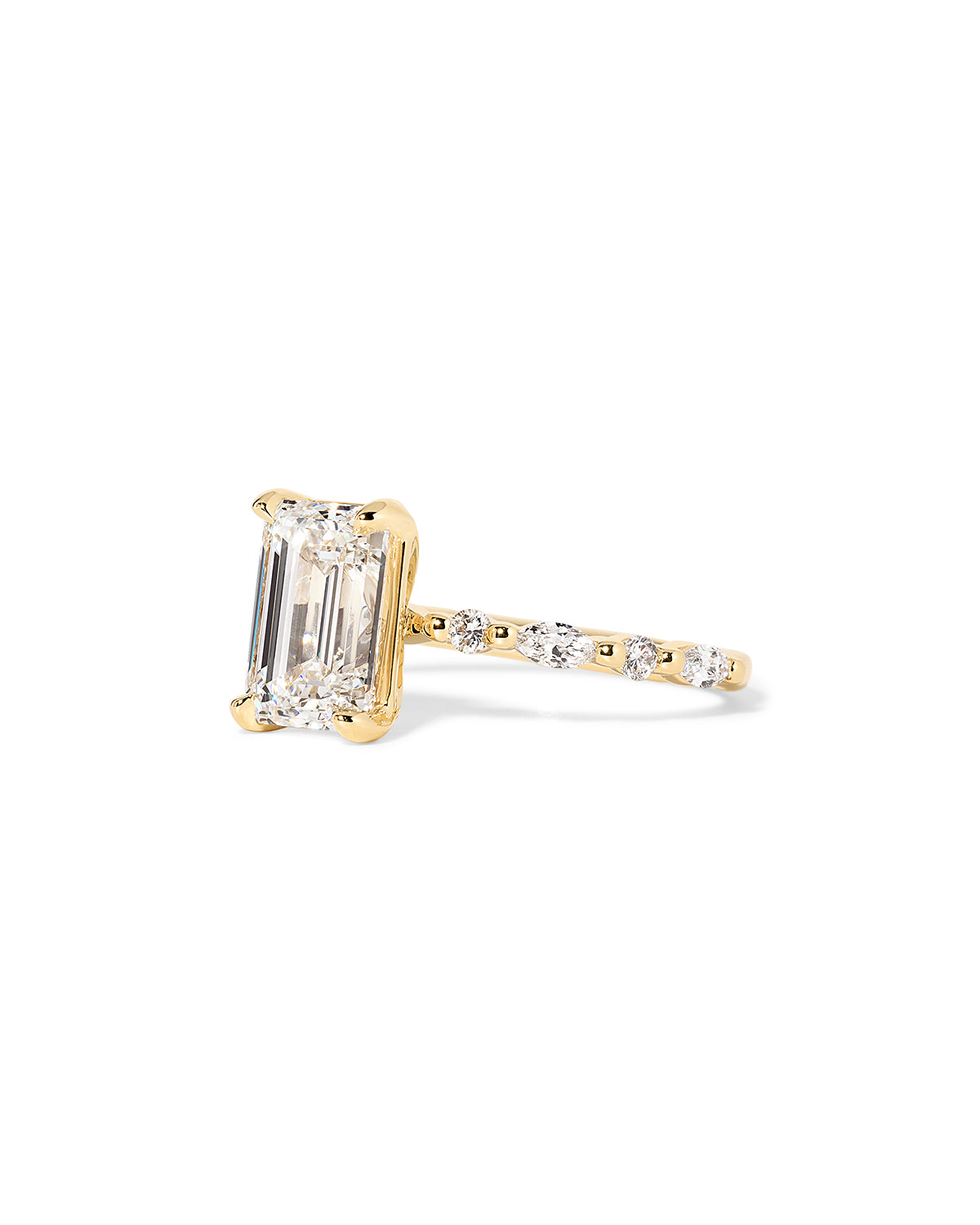 The Tori Emerald is a delicate, modern design with an airy, refined feel. It features a floating diamond band of alternating marquise and round diamonds, creating soft sparkle and elegant movement along the finger. The center stone is held with a high-polish belt, adding extra security while maintaining a clean, elevated look.