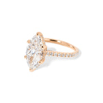 The Alice features a classic pavé band that adds timeless sparkle, paired with a graceful cathedral-style body for an elevated, elegant profile. Beneath the center stone, a hidden inner under-halo offers subtle detail, while a diamond bridge completes the design with beautiful brilliance from every angle.