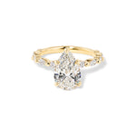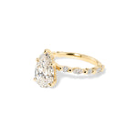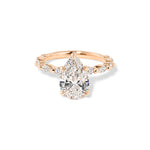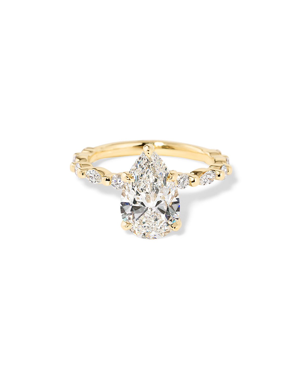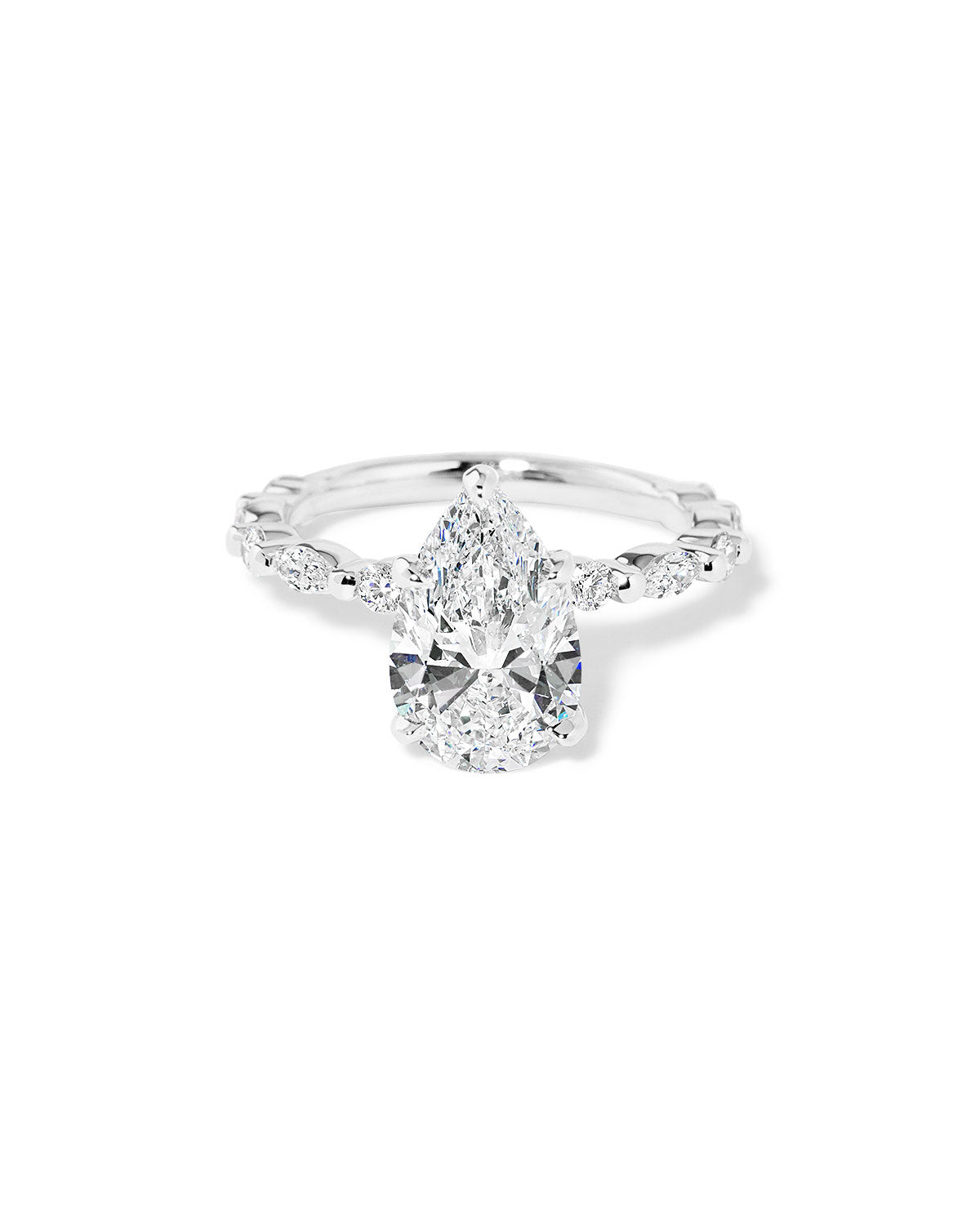 The Rei features a floating diamond band of marquise and round diamonds with a hidden inner under halo