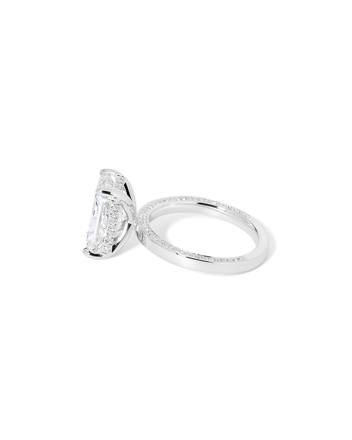 Sleek, modern, and effortlessly elegant, the Remi Radiant is designed to highlight clean lines with refined sparkle. This style features a high-polish 2mm band accented with diamonds set along the edges on each side, adding subtle brilliance while keeping a smooth, contemporary profile. The radiant center stone is elevated by a hidden inner under-halo, offering delicate detail beneath the setting without overwhelming the design.