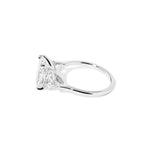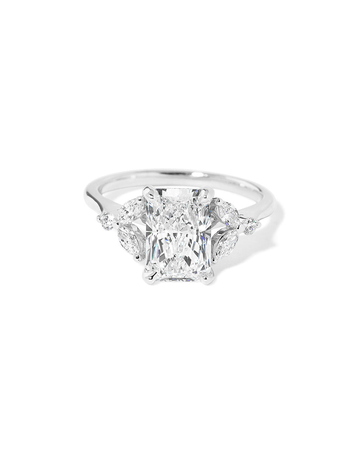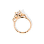 The Sarah features a tapered high polish comfort fit band with a trio of diamonds. The trio features two marquises and one round diamond. The baskets are all lifted to fit a straight band flush against the body.