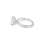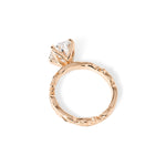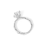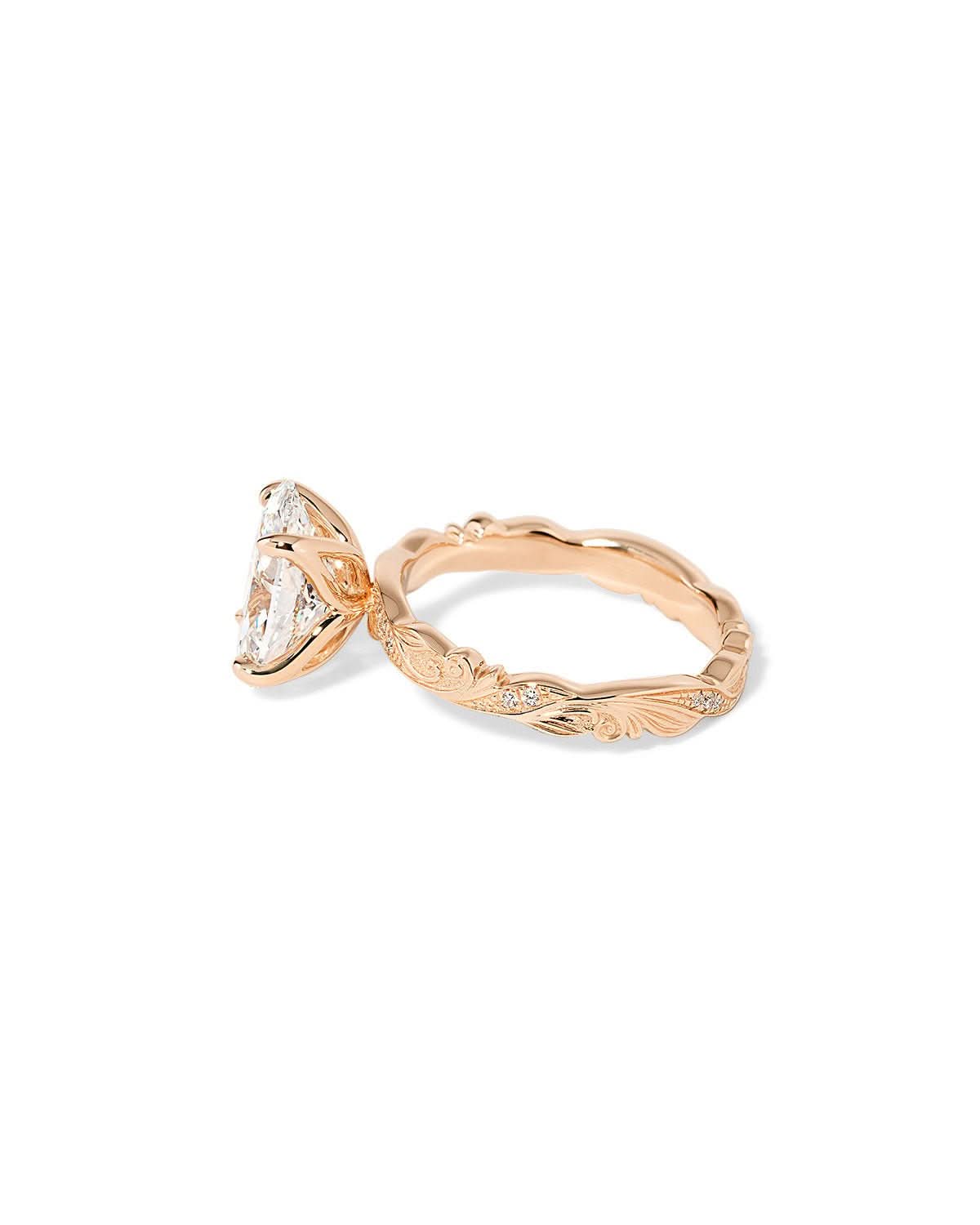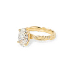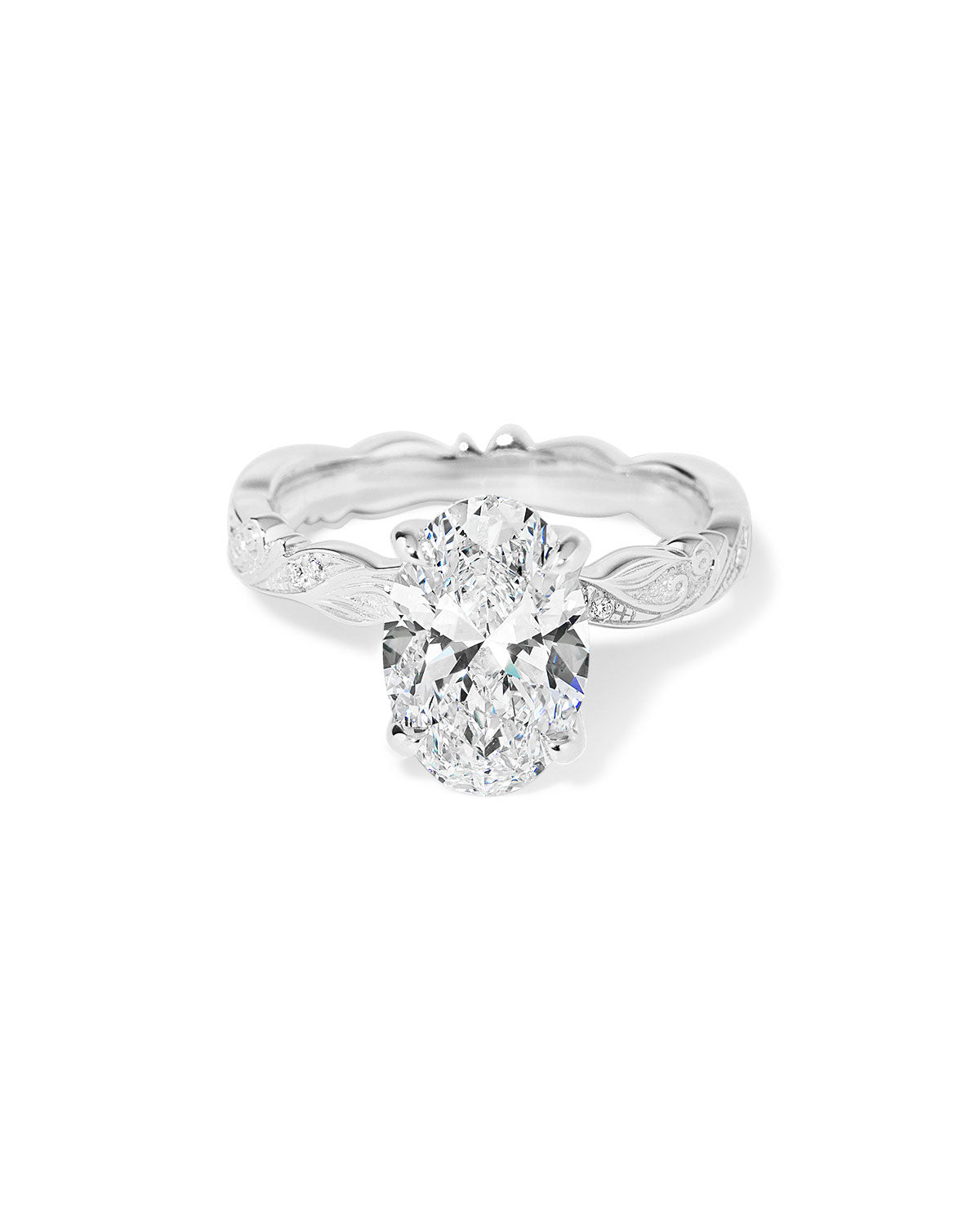Whimsical and vintage-inspired, the Josephine Oval features a bold 3mm band with beautifully sculpted detailing for an heirloom look. Accent diamonds travel 75% of the way around, adding brilliance from nearly every angle, while the oval center stone is secured in romantic petal prongs for a soft floral finish. The decorative pattern continues all the way around the band for a fully finished, vintage feel.
