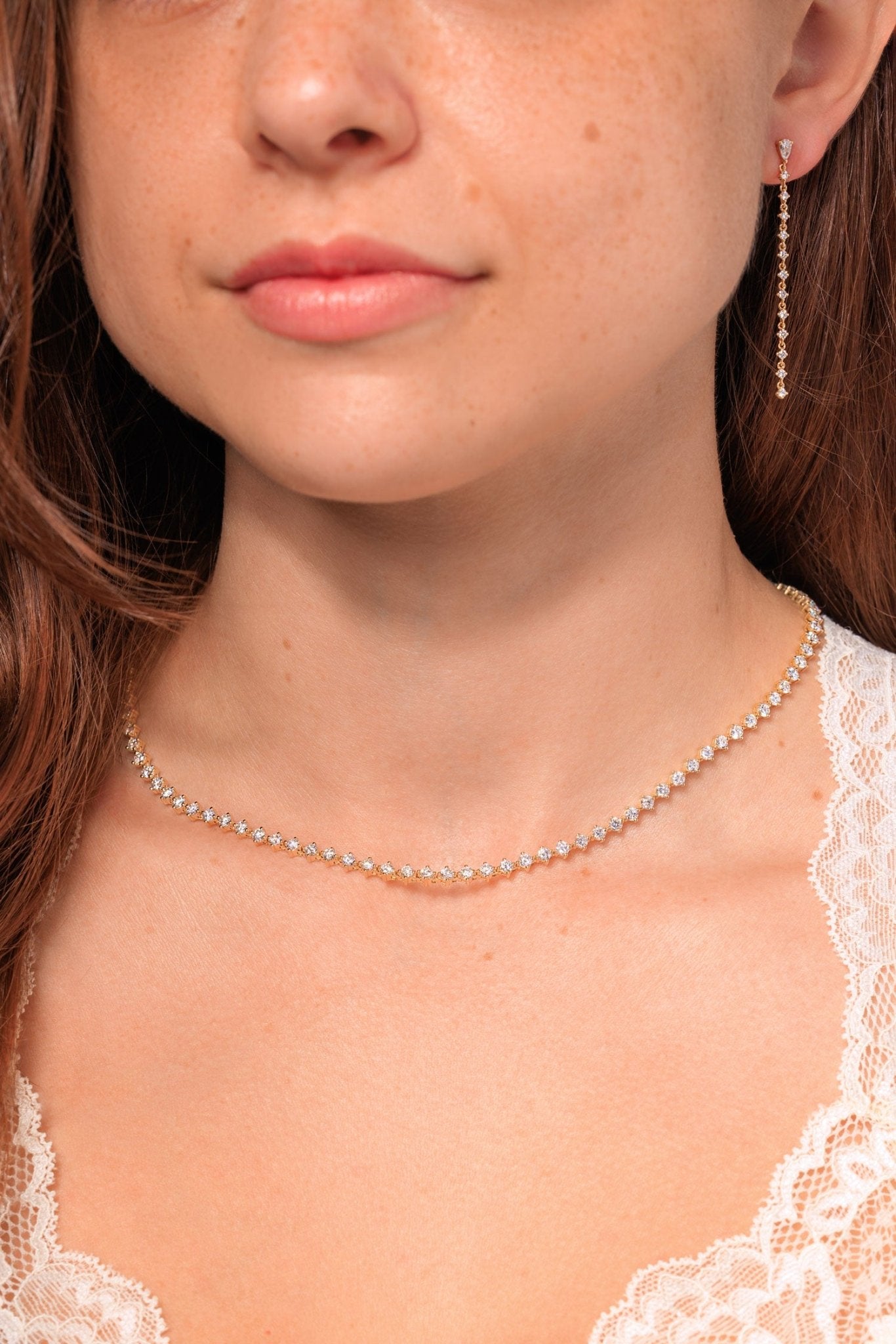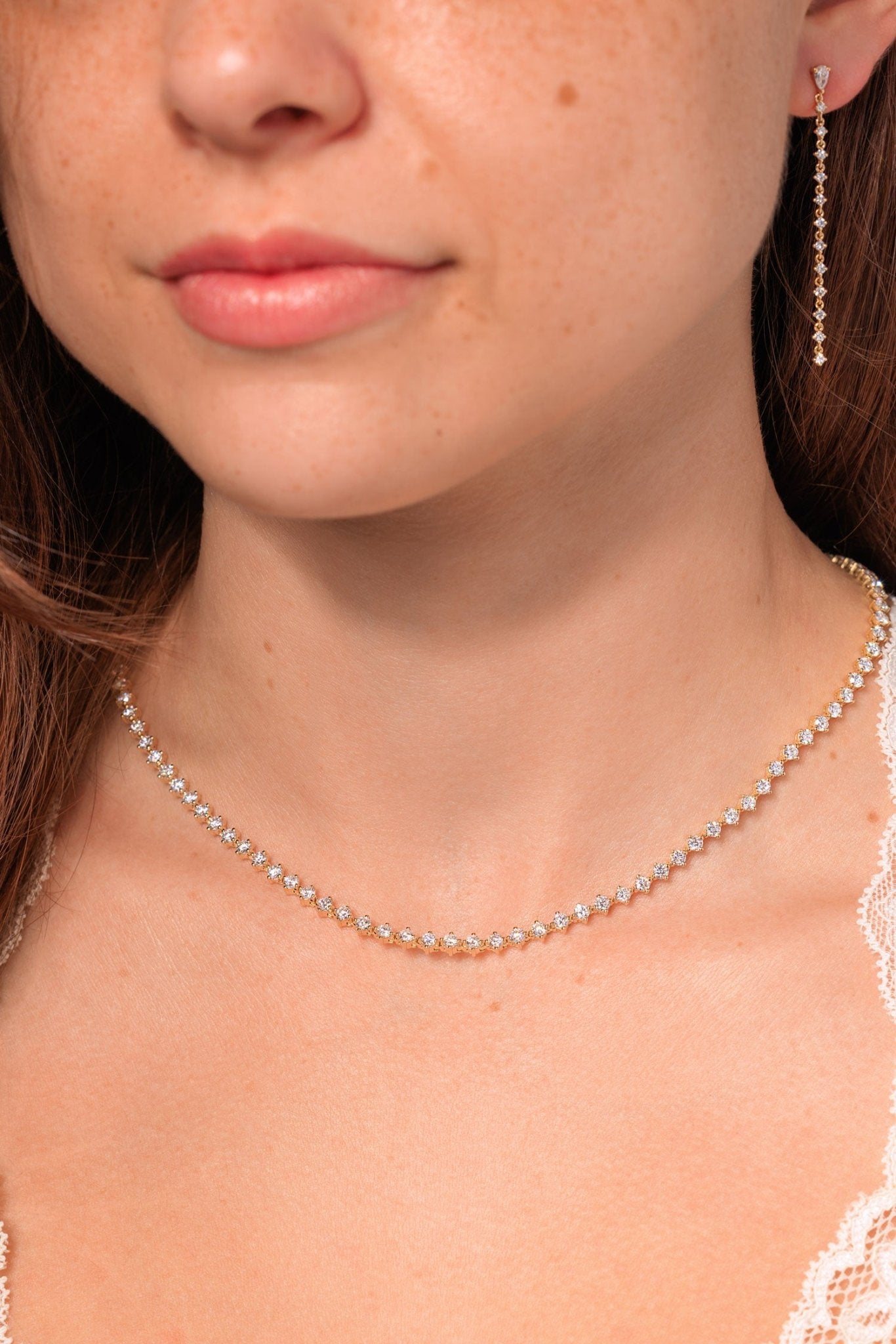 Crafted in 14k yellow gold, this 16-inch tennis necklace is set with 104 lab-grown round diamonds totaling an impressive 7.96ct total weight. The compass setting securely frames each diamond while creating a delicate star-like shape, allowing maximum light and brilliance along the neckline.