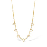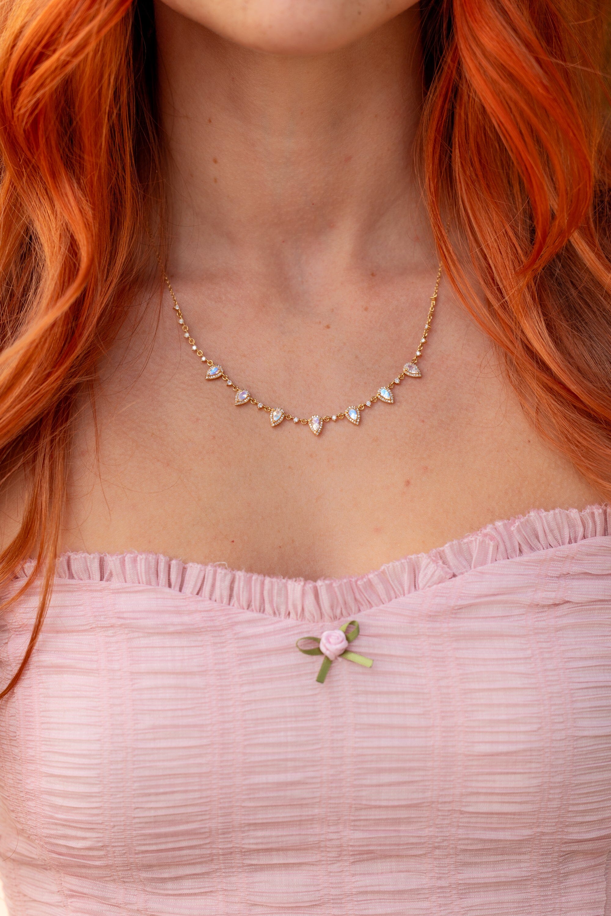 Soft, romantic shimmer with the prettiest sparkle. This necklace features pear-shaped natural moonstones framed in diamond halos, linked with station diamond accents along a delicate 14k yellow gold chain. Finished with a lobster clasp and adjustable 16–18" length, it’s an effortless statement for everyday glow or special moments.
