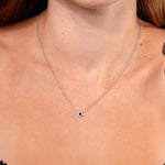 Elegant and vibrant, this necklace features a 0.14ct natural blue sapphire surrounded by a shimmering pavé diamond halo, adding the perfect touch of sparkle and color. Set in 14k white gold and paired with an adjustable chain, it’s a timeless piece for everyday wear or special occasions.