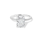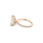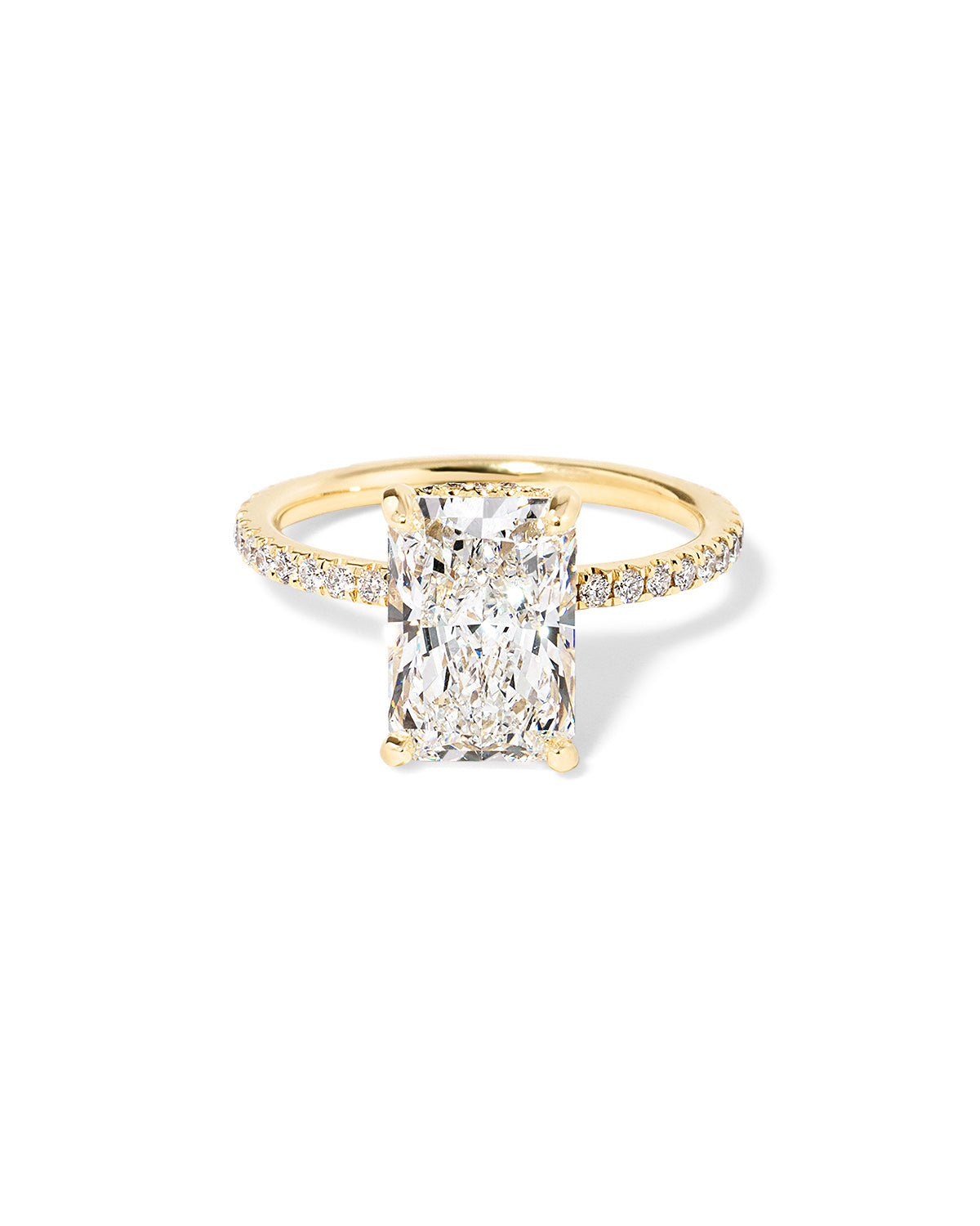 The Stephanie features a classic pavé band with a hidden wrap under halo.