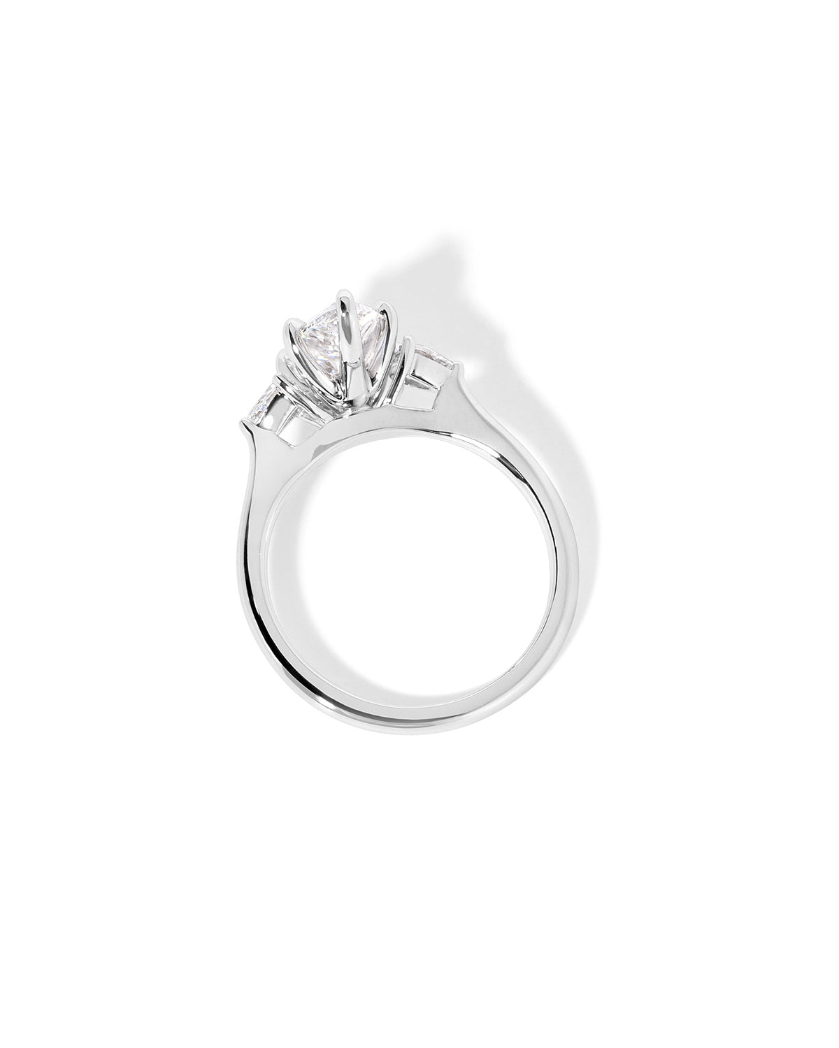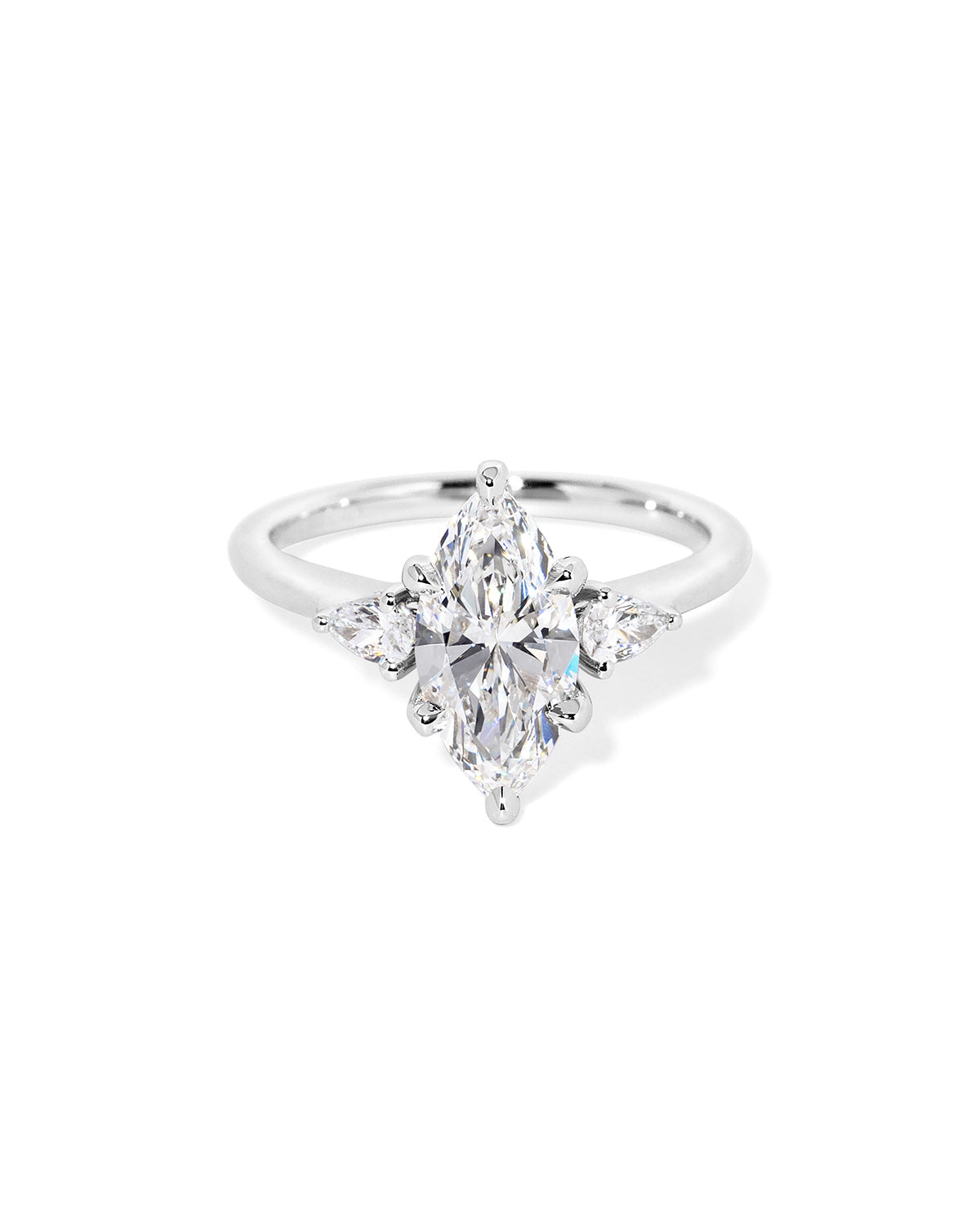 The Gracie features a high polish comfort fit band with two 5x3mm lab pear diamond side stones.