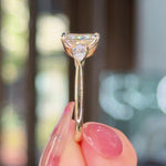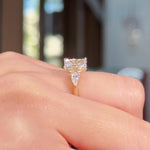 The Lisa features a high-polished comfort-fit band with two 5x3mm lab pear diamond side stones and our signature petal prongs.