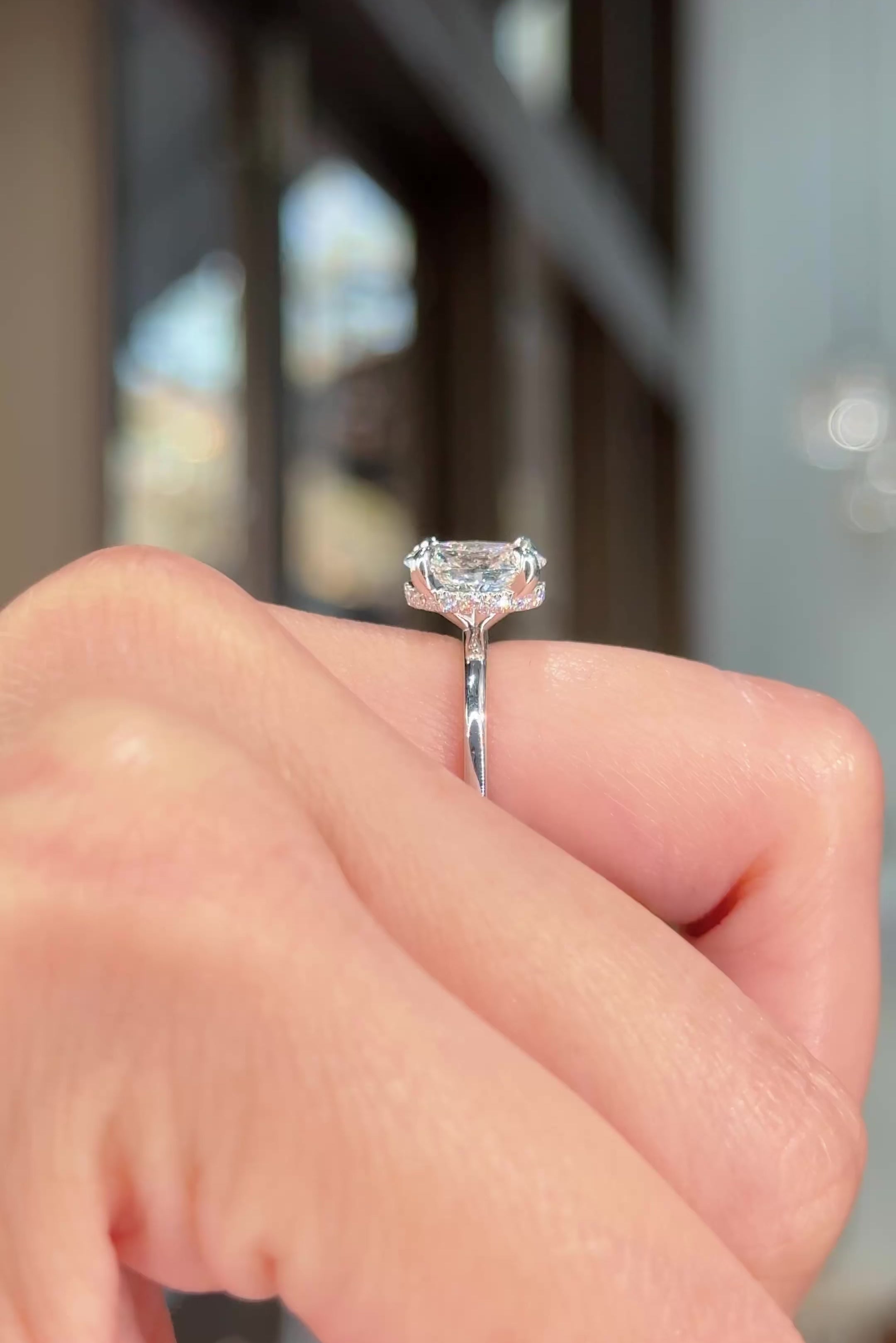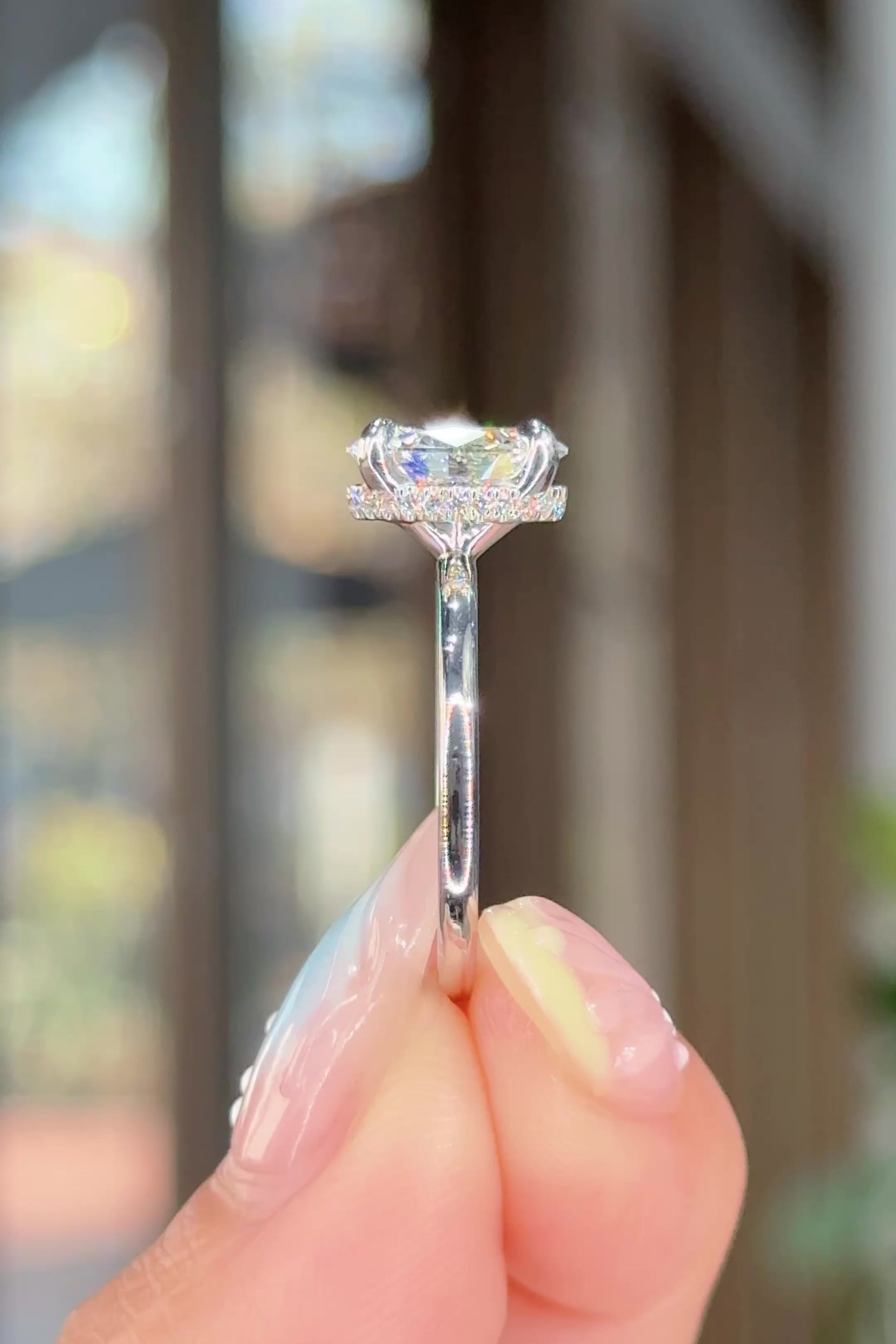The Stephanie features a classic high polish band with a hidden wrap under halo.