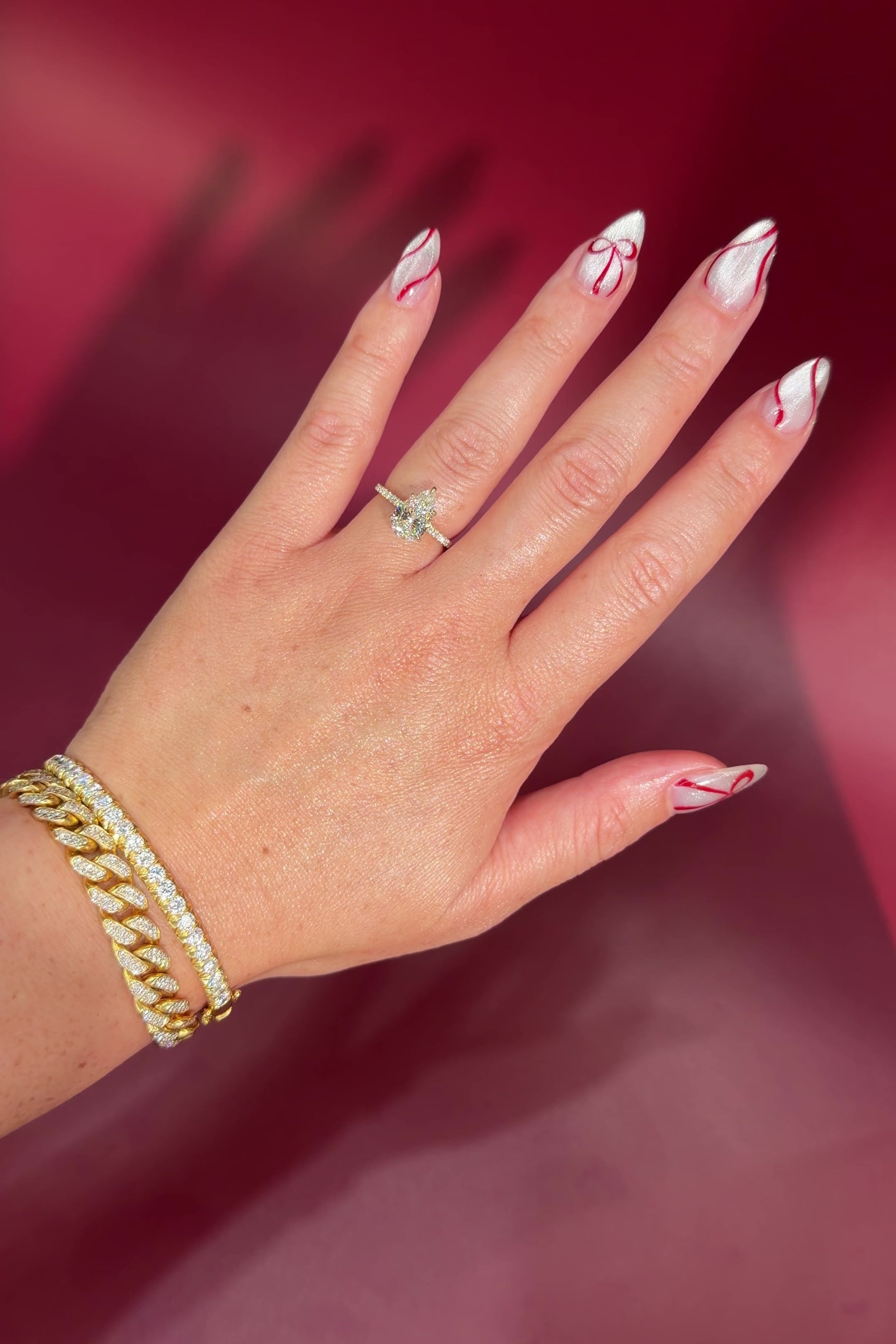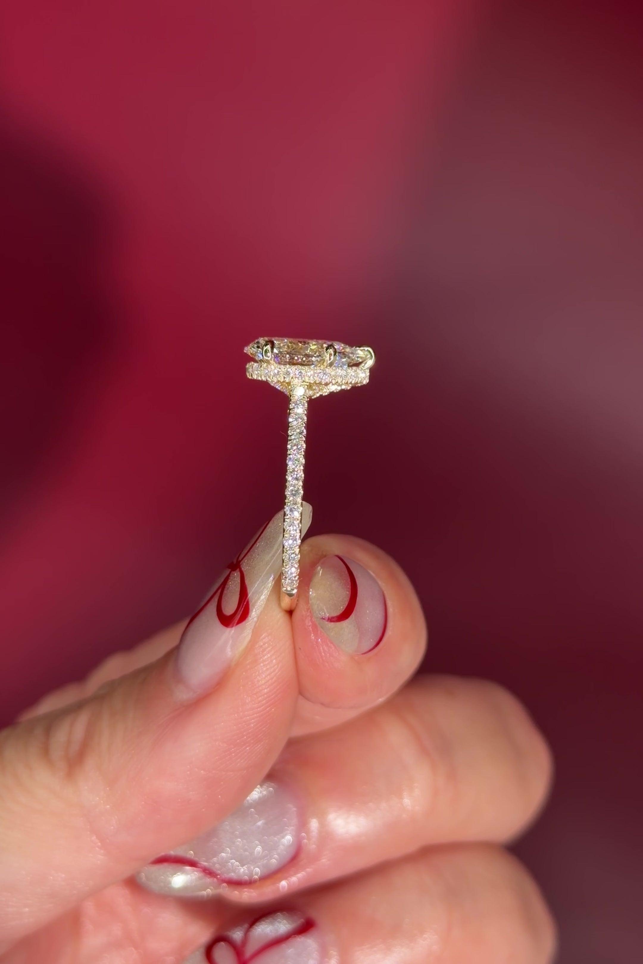 The Stella features a classic pave band with a hidden wrap under halo, pavé diamond prongs, and pavé diamond bridge.