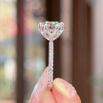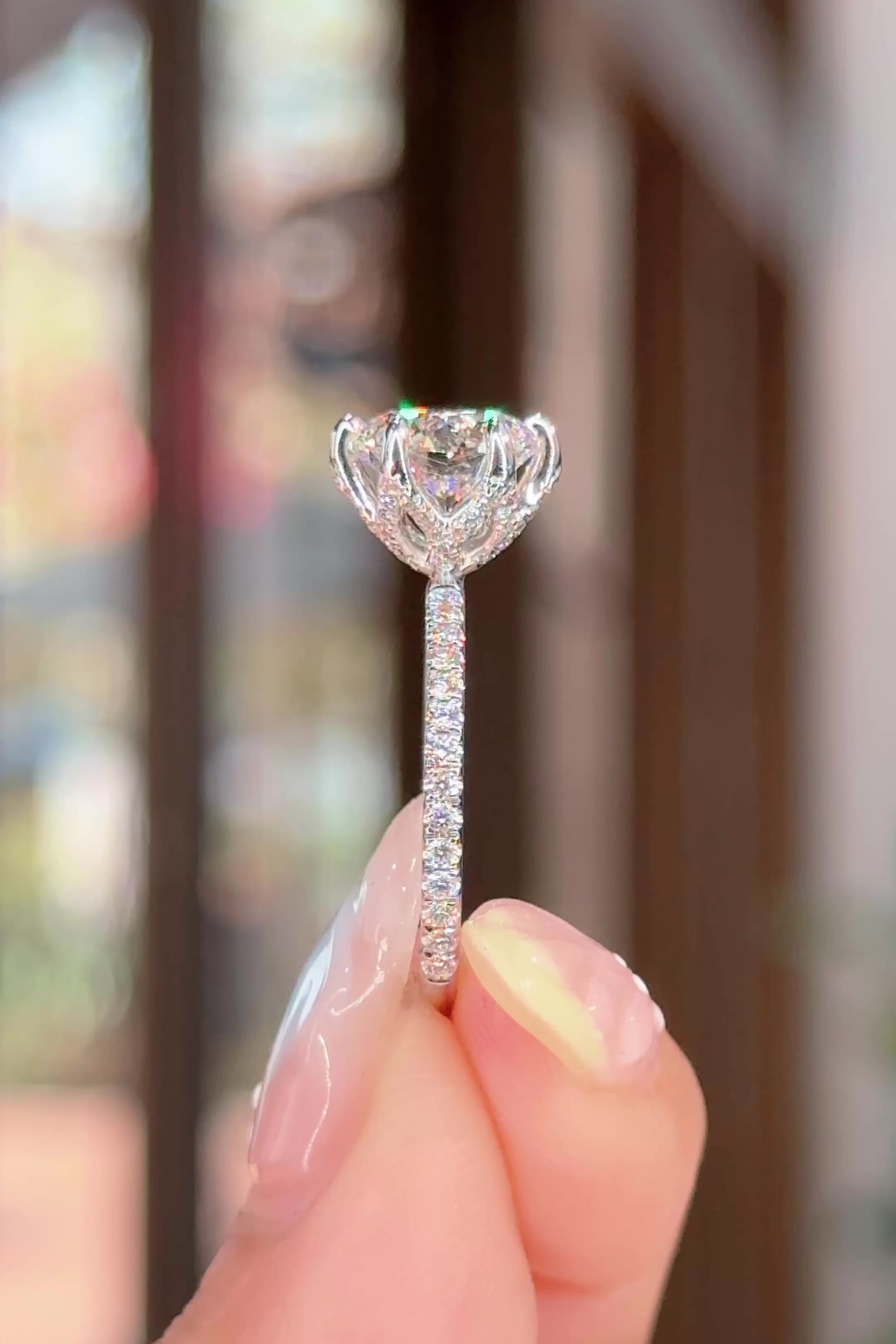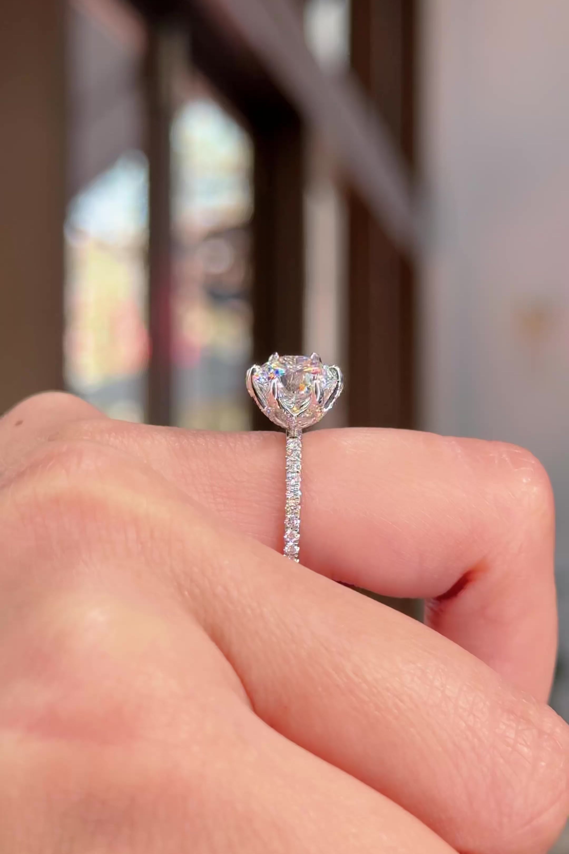 The Samantha is our signature diamond petal prong engagement ring, taking inspiration from the delicate petals of a lotus flower. This exquisite piece is fashioned in a traditional body style and comes with the option of either a high-polish finish or pavé diamonds on the band, complemented by a comfort-fit design.
