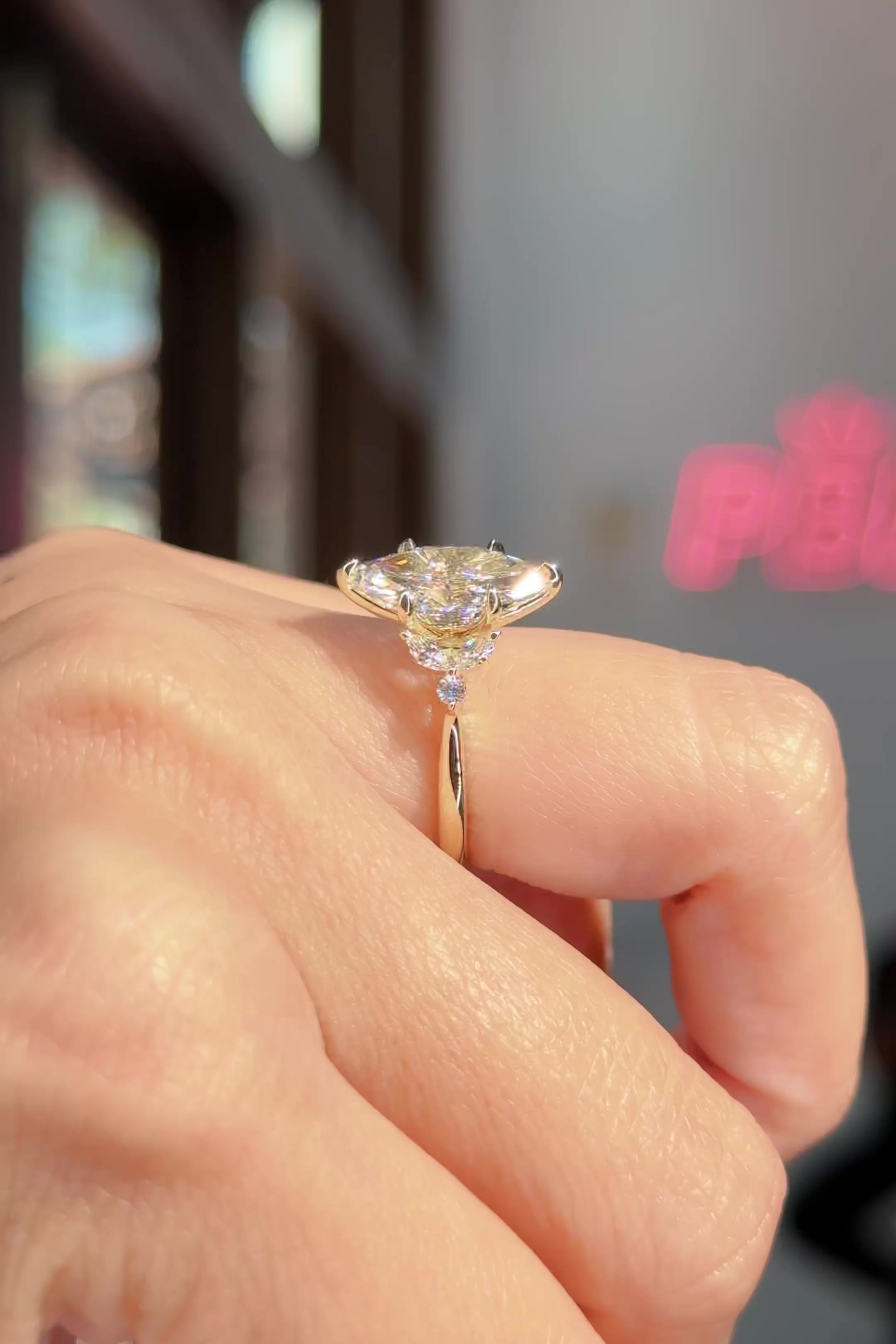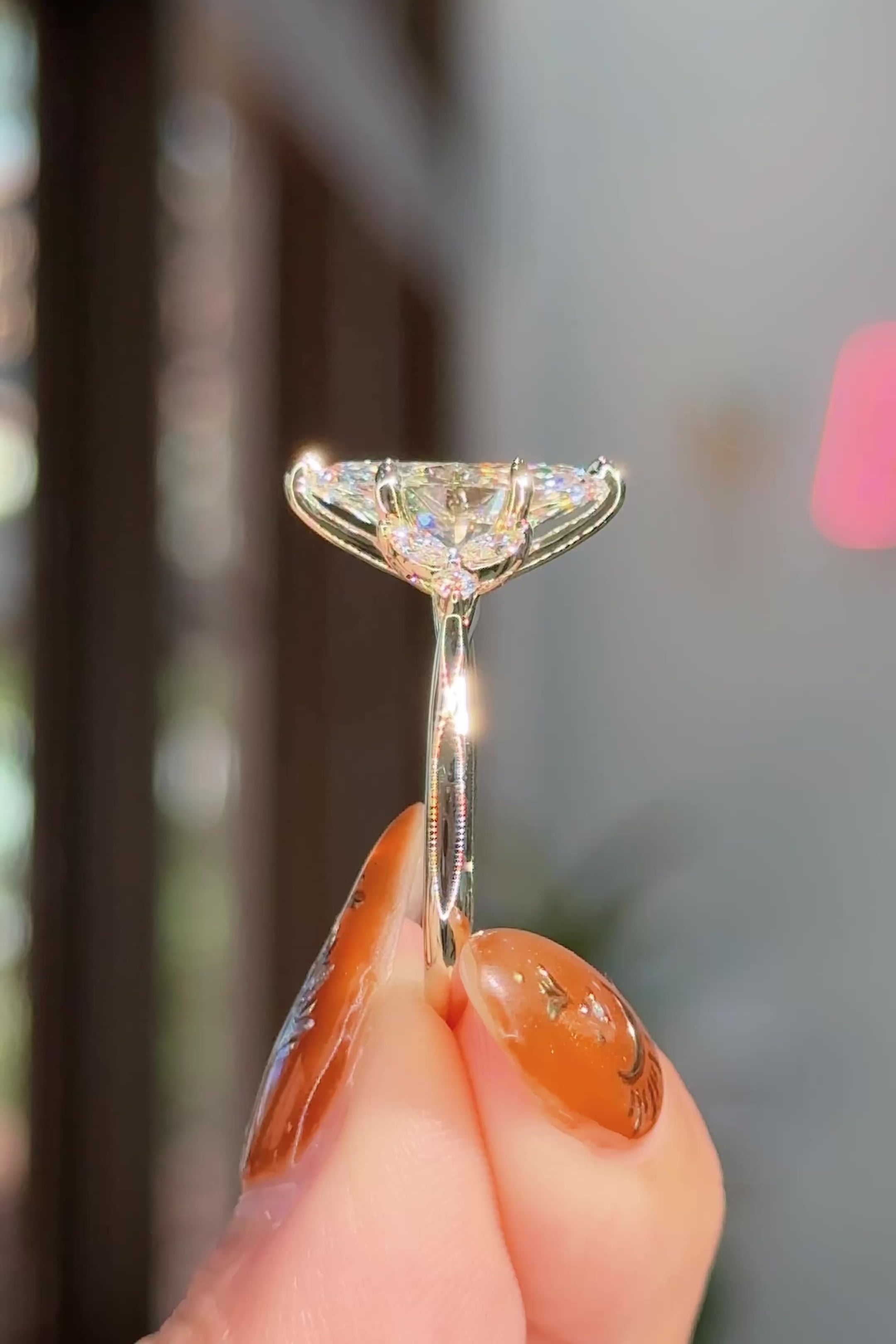 The Sarah features a tapered high polish comfort fit band with a trio of diamonds. The trio features two marquises and one round diamond. The baskets are all lifted to fit a straight band flush against the body.